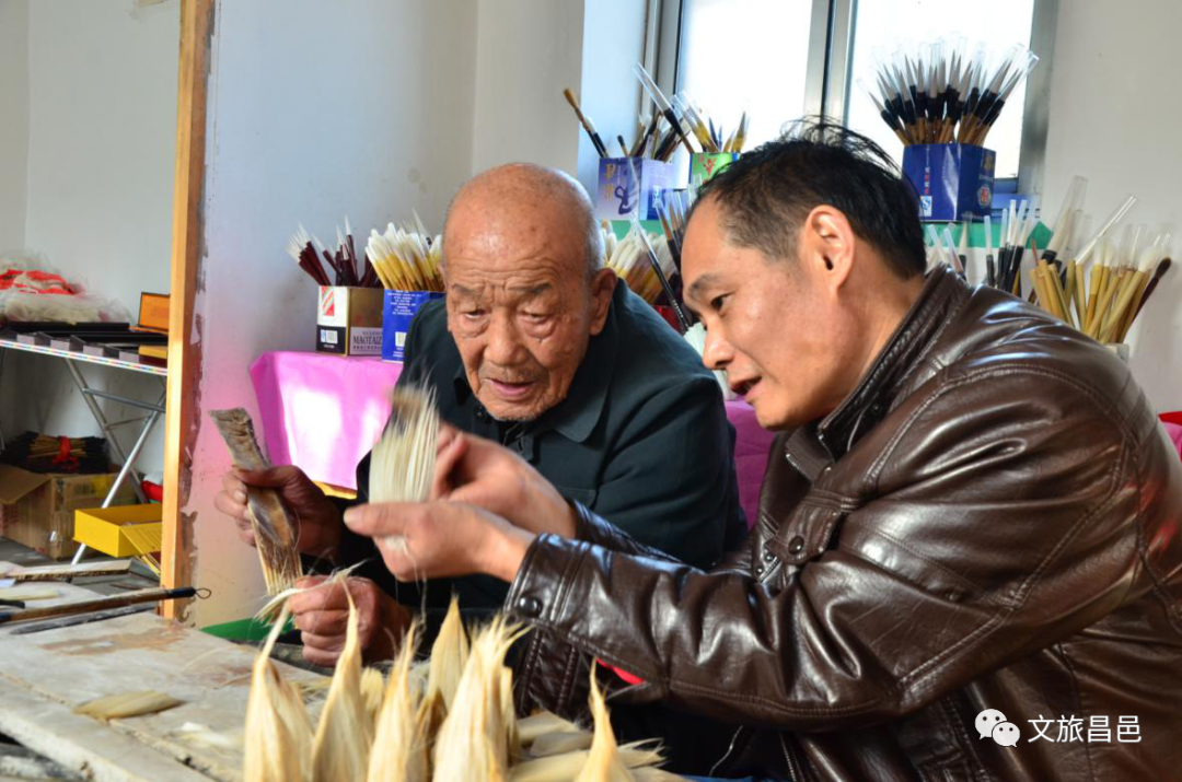同文堂毛笔第三代传承人朱永森与第四代传承人朱凤祥切磋技艺