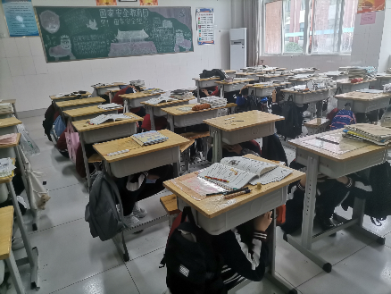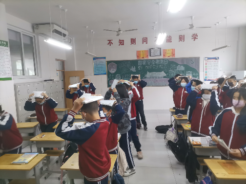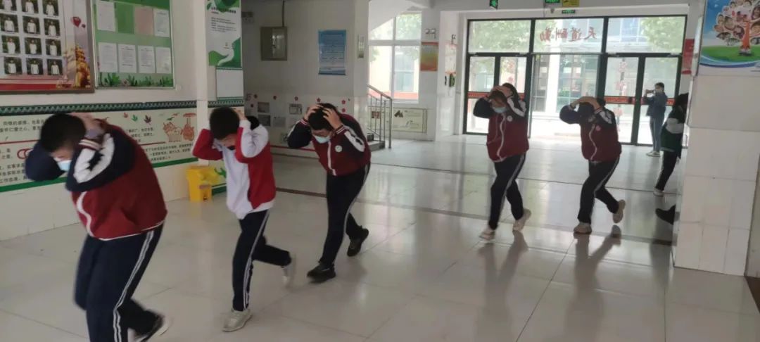 三、演练进行中。地震警报响起,同学们在老师指挥下,首先到课桌下躲避。