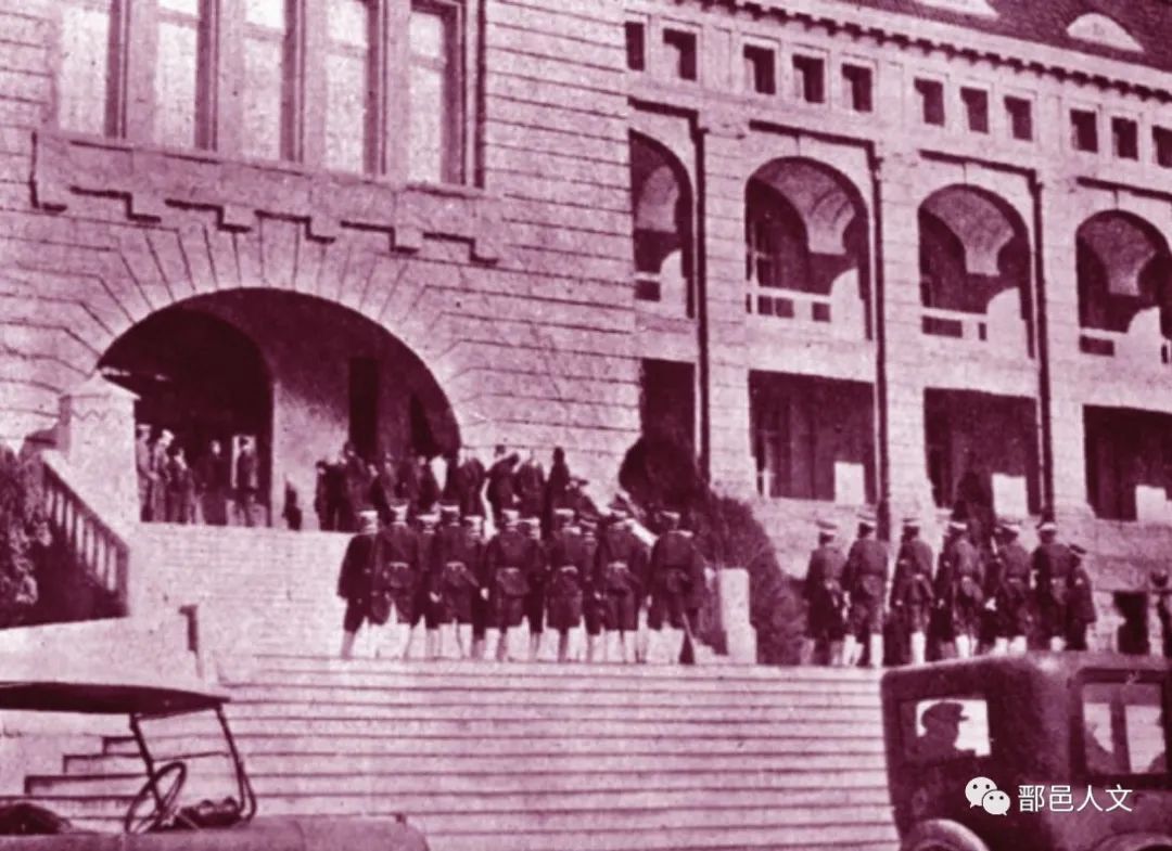 1922年12月10日正午,日本将行政权移交中国,青岛市内警察岗亭全部换成中国警察。图为胶澳督办公署(前日本守备军司令部)中日值勤卫兵的岗位交接。