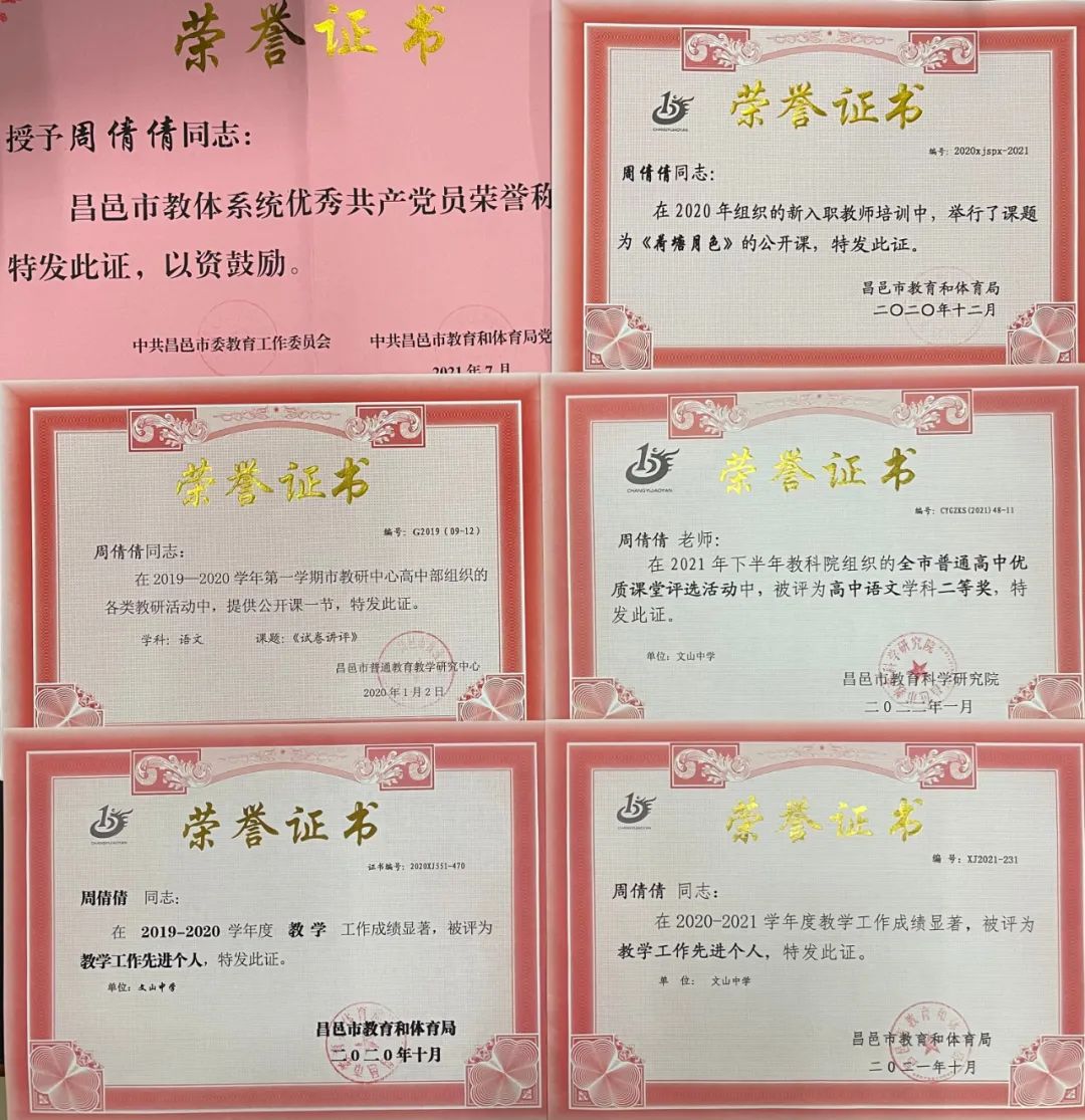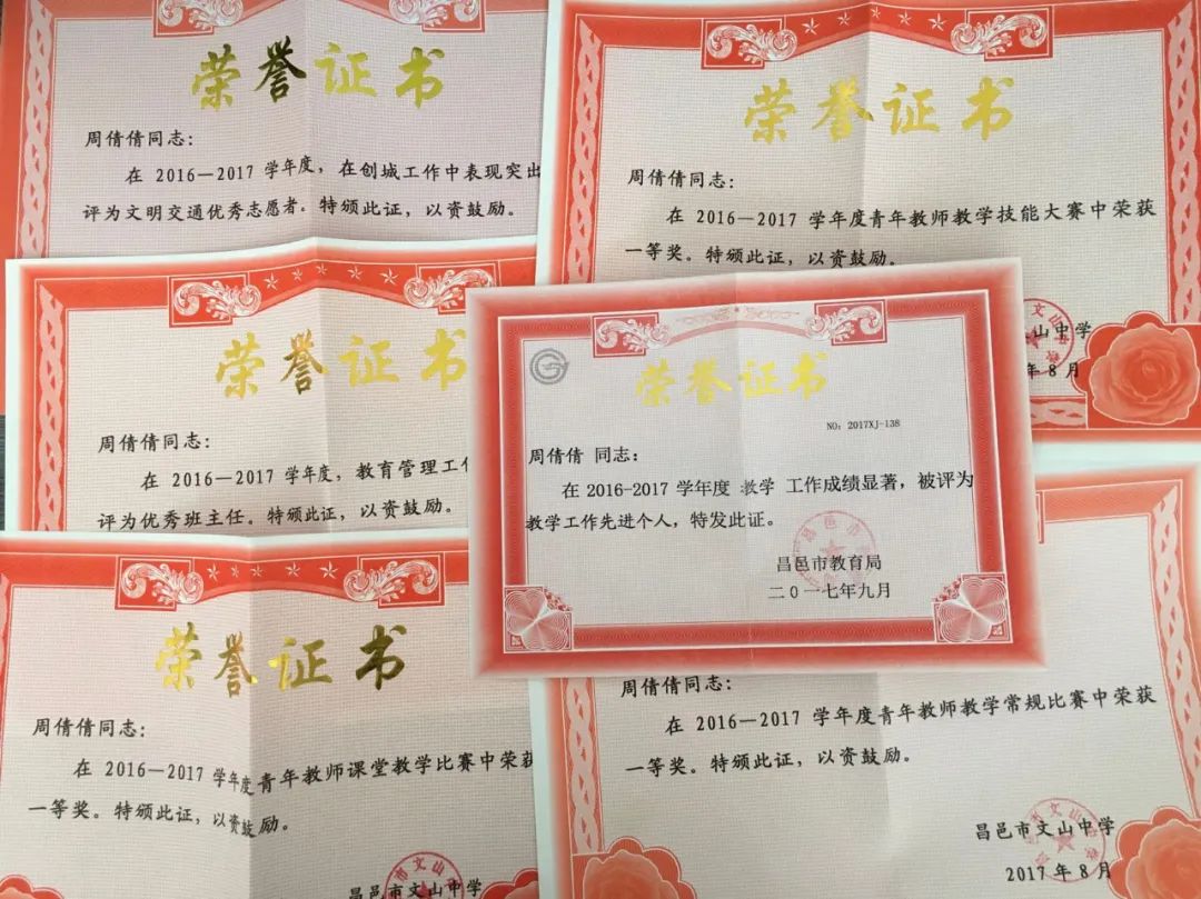 参加工作以来,她始终坚持党的教育方针与政策,爱岗敬业,忠于职守,以高度负责的政治责任感和强烈的事业心做好每项工作,把全部的心血倾注到教育教学实践活动中,用自己的汗水与辛勤培育着学生们。先后荣获昌邑市优秀教师、昌邑市优秀共产党员等荣誉称号;多次获得昌邑市教学成果奖;连续四年获得昌邑市教学工作先进个人荣誉称号;在教研中心组织的各类教研活动中,多次提供公开课。2022年,所带班级获得高中阶段学校“省级优秀班集体”荣誉称号。