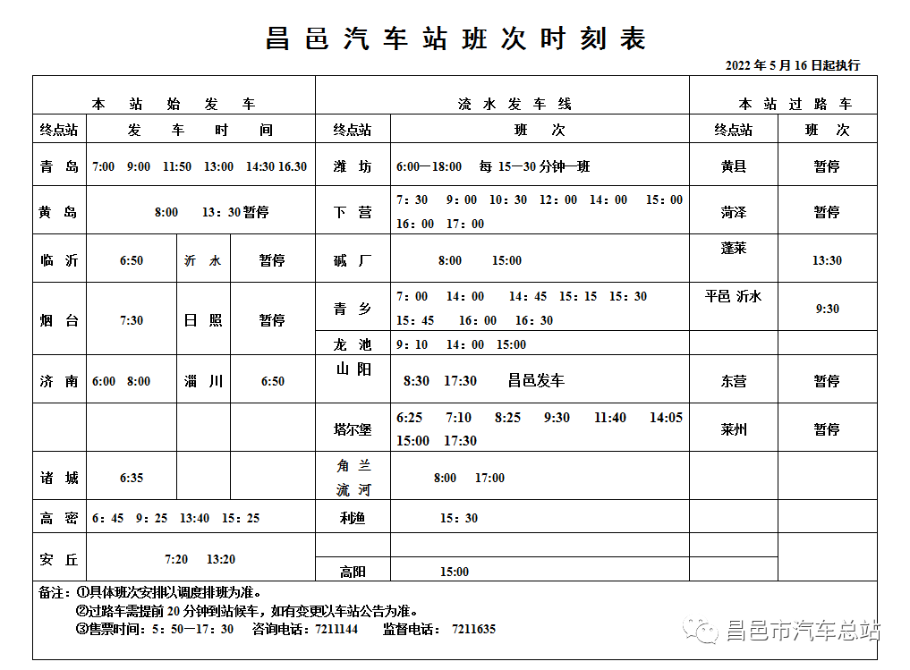 特殊时期班次计划根据防控形势可能随时有所调整,广大旅客如有出行计划,可关注总站官方微信公众号,或拨打昌邑汽车总站客服热线0536-7211144,了解最新发车信息。