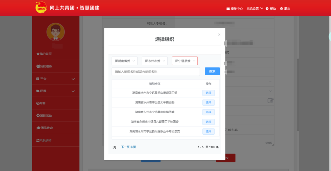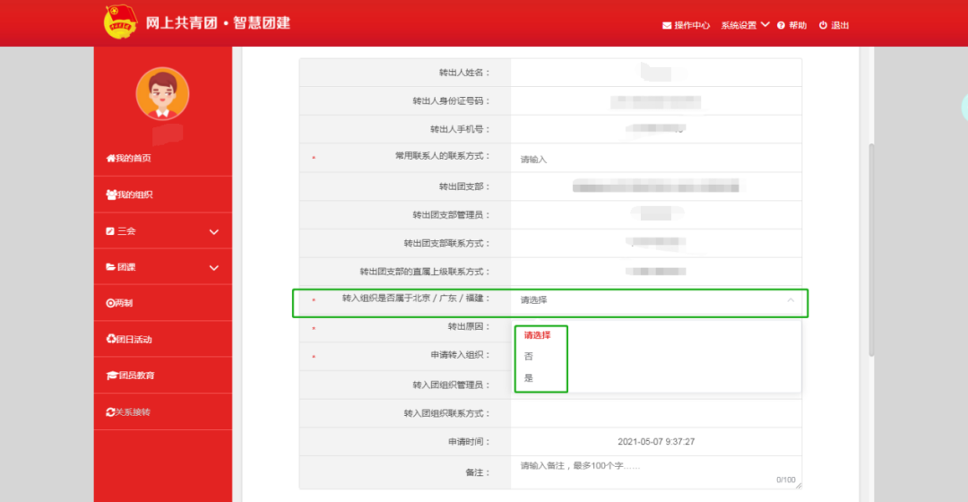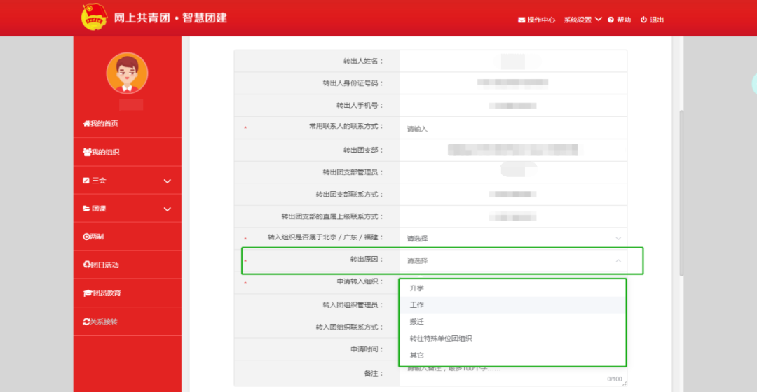(进行系统操作前,请务必确认、联系好自己的“拟转出组织全称”(附后),再进行操作。国内升学的同学转入升学学校;工作的同学可转入单位或公司团支部,若单位或公司没有团支部可转接至工作单位所在地的乡镇街道团组织;待业的同学可转回户籍地。)。