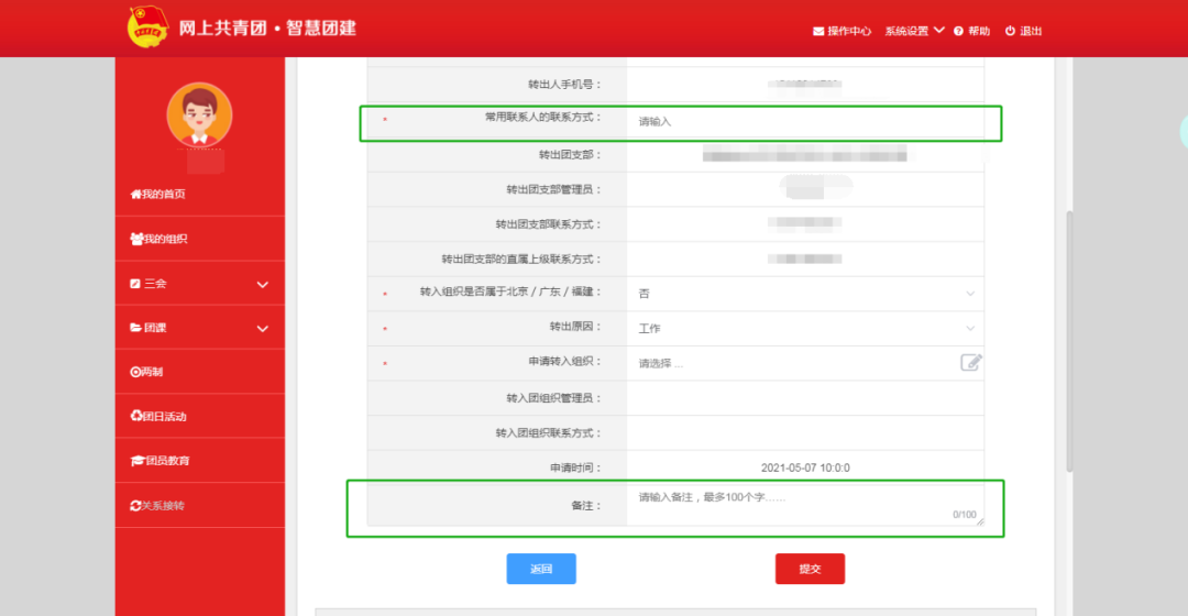 各位团员在系统提交团组织关系转接申请前(后),请及时联系需转入团组织的管理员,并按转入团组织要求进行相关操作。