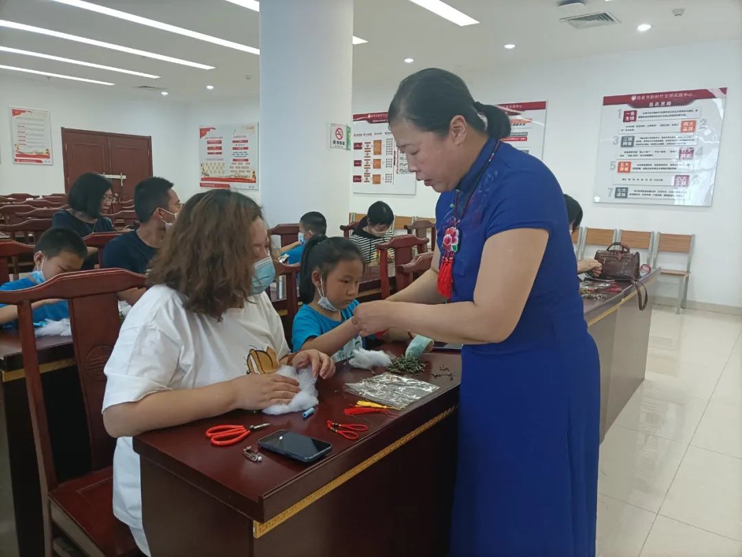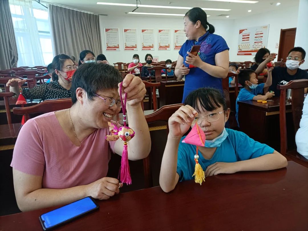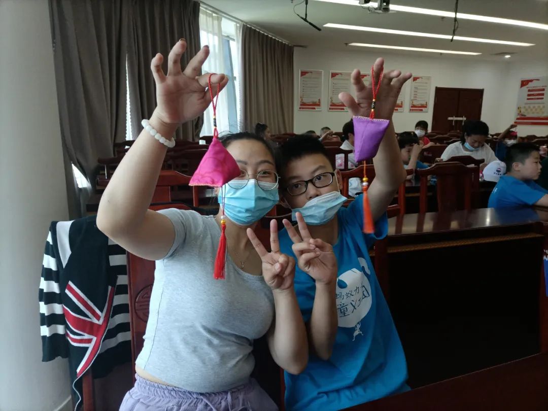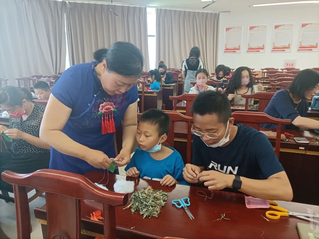 布片、彩绳、针线、艾草等材料准备就绪,在耿老师的讲授和指导下,孩子们与家长一起迫不及待地制作起来。一针一线,细针轻舞,巧手穿梭,在缝好的小布袋里装进丝棉和艾草,再加点小配件,漂亮的香包就完成了。看着通过自己努力完成的作品,孩子们都乐开了花,拿起自己制作的香包来闻一闻,满满的幸福。