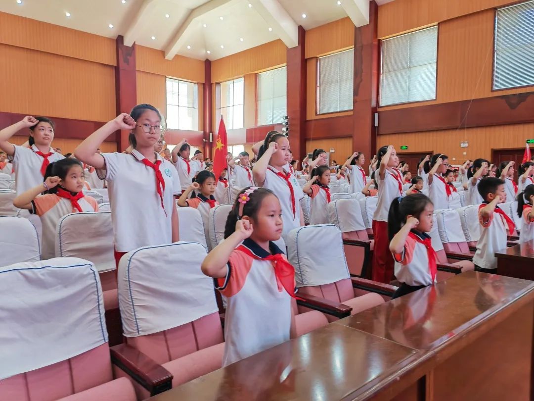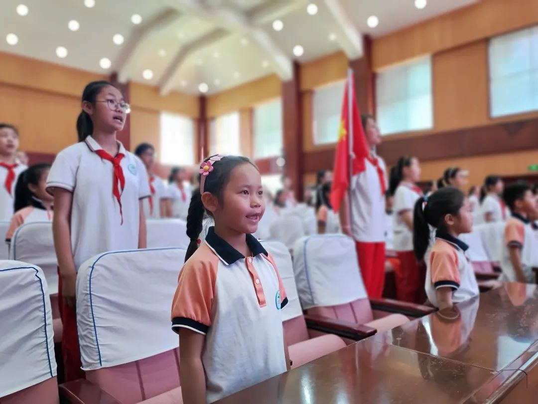 戴上鲜艳的红领巾,角色的转换让每一个新队员心情激动。伴着豪迈的音乐,全场高唱《中国少年先锋队队歌》;向着队旗,庄严敬礼;“为了共产主义事业,时刻准备着”的少先队誓词响彻校园上空。