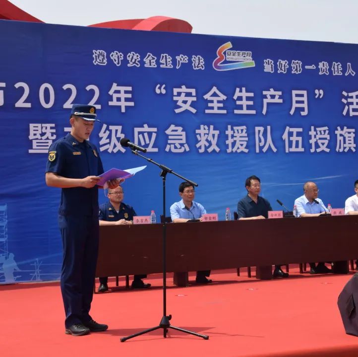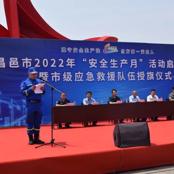今年6月是第21个全国“安全生产月”,主题是“遵守安全生产法,当好第一责任人”。6月2日上午,我市在文化广场举行2022年“安全生产月”活动启动仪式暨市级应急救援队伍授旗仪式。省畜牧兽医局机关党委专职副书记、省派昌邑市“四进”工作支队支队长徐秋团,潍坊市应急管理局二级调研员颜政,昌邑市委常委、市政府副市长郇金刚,昌邑市消防救援大队大队长李言杰,昌邑市人武部政治工作科干事孙立建出席仪式。仪式由昌邑市应急管理局局长夏小伟主持,各镇街区、市安委会有关成员单位、有关企业负责同志参加。