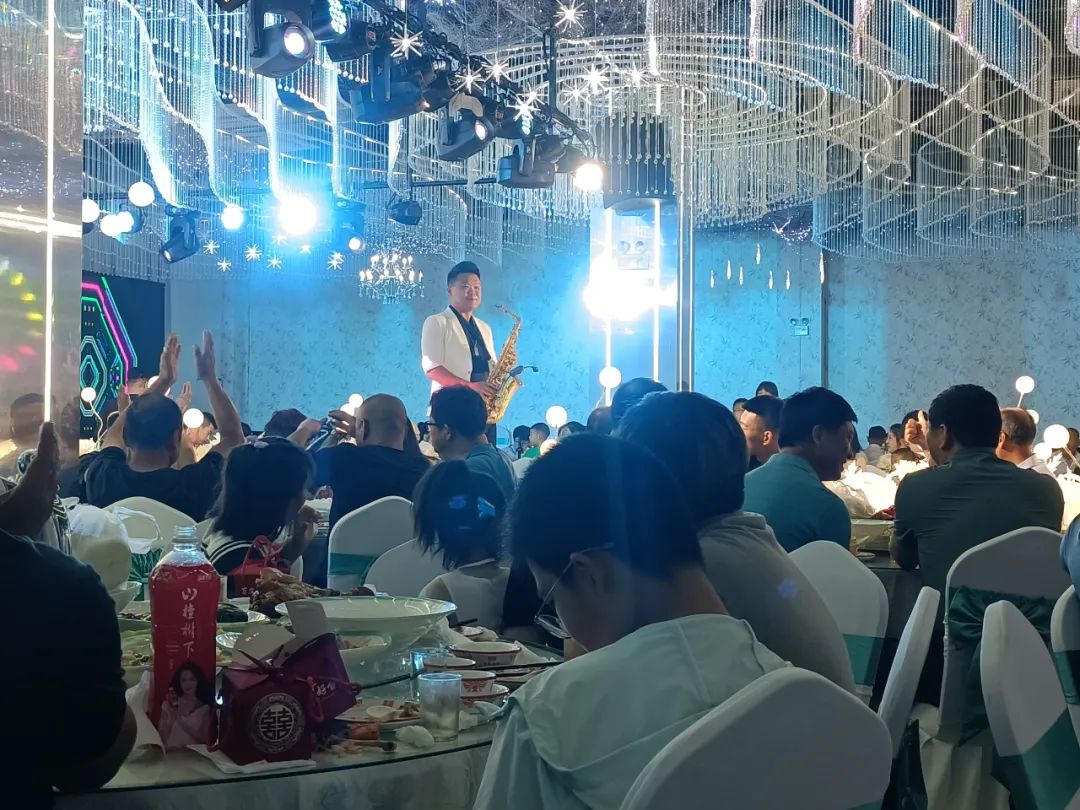 今天中午参加村里孩子的婚宴了,席间年轻帅气的司仪拿出萨克斯,即兴为在场来宾演奏了一首首激情四射的旋律,五彩缤纷的灯光伴随着翩翩起舞的音符,整个婚礼现场被快乐点燃了……