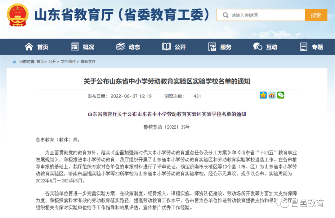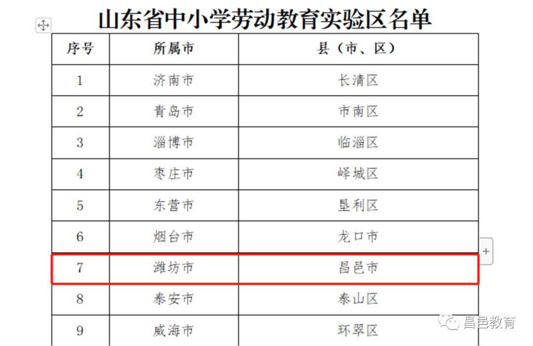 首页 新闻动态 昌邑市成潍坊地区唯一山东省中小学劳动教育实验区 昌邑市成潍坊地区唯一山东省中小学劳动教育实验区 昌邑之窗 发布于 2022年6月9日 评论关闭 阅读(602) 6月7日,《关于公布山东省中小学劳动教育实验区实验学校名单的通知》(鲁教基函【2022】39号)公布山东省中小学劳动教育实验区和劳动教育实验学校名单,我市作为潍坊市唯一县市区被认定为山东省中小学劳动教育实验区。