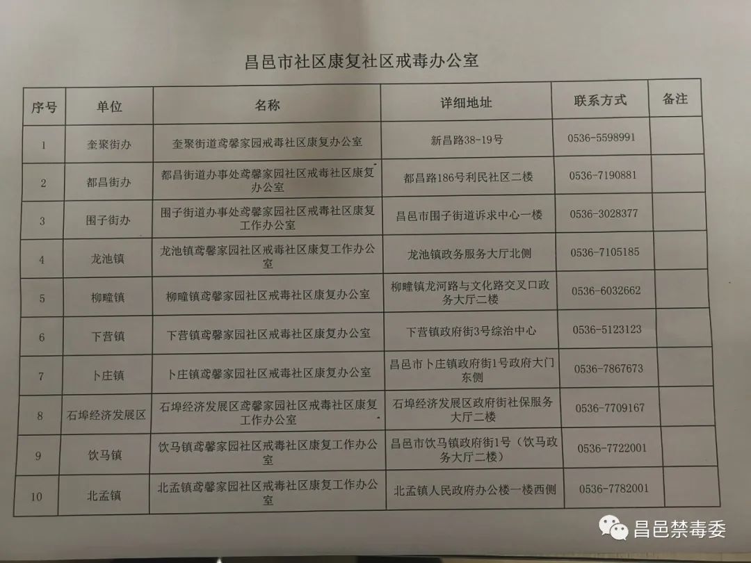 为进一步加强对社区戒毒社区康复人员的管理,昌邑市禁毒办将重新调整后的全市各镇街区社区戒毒社区康复办公室地址及联系方式向社会公布,便于社区戒毒社区康复人员依法戒毒,接受社会监督。