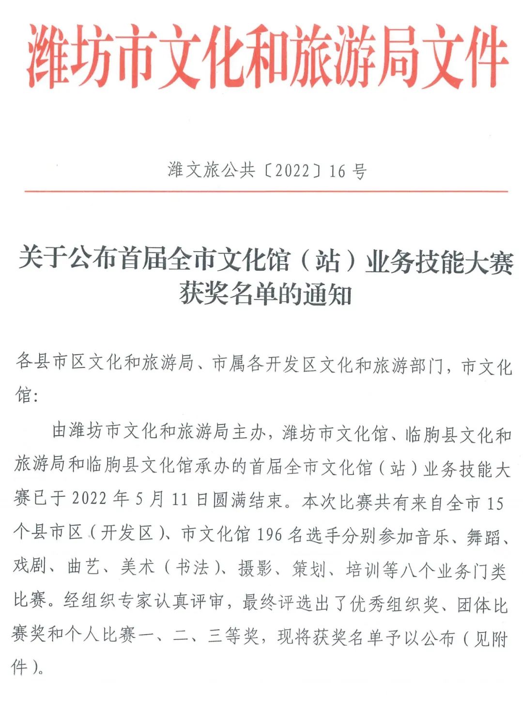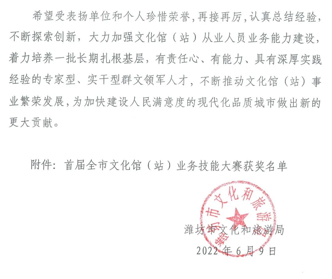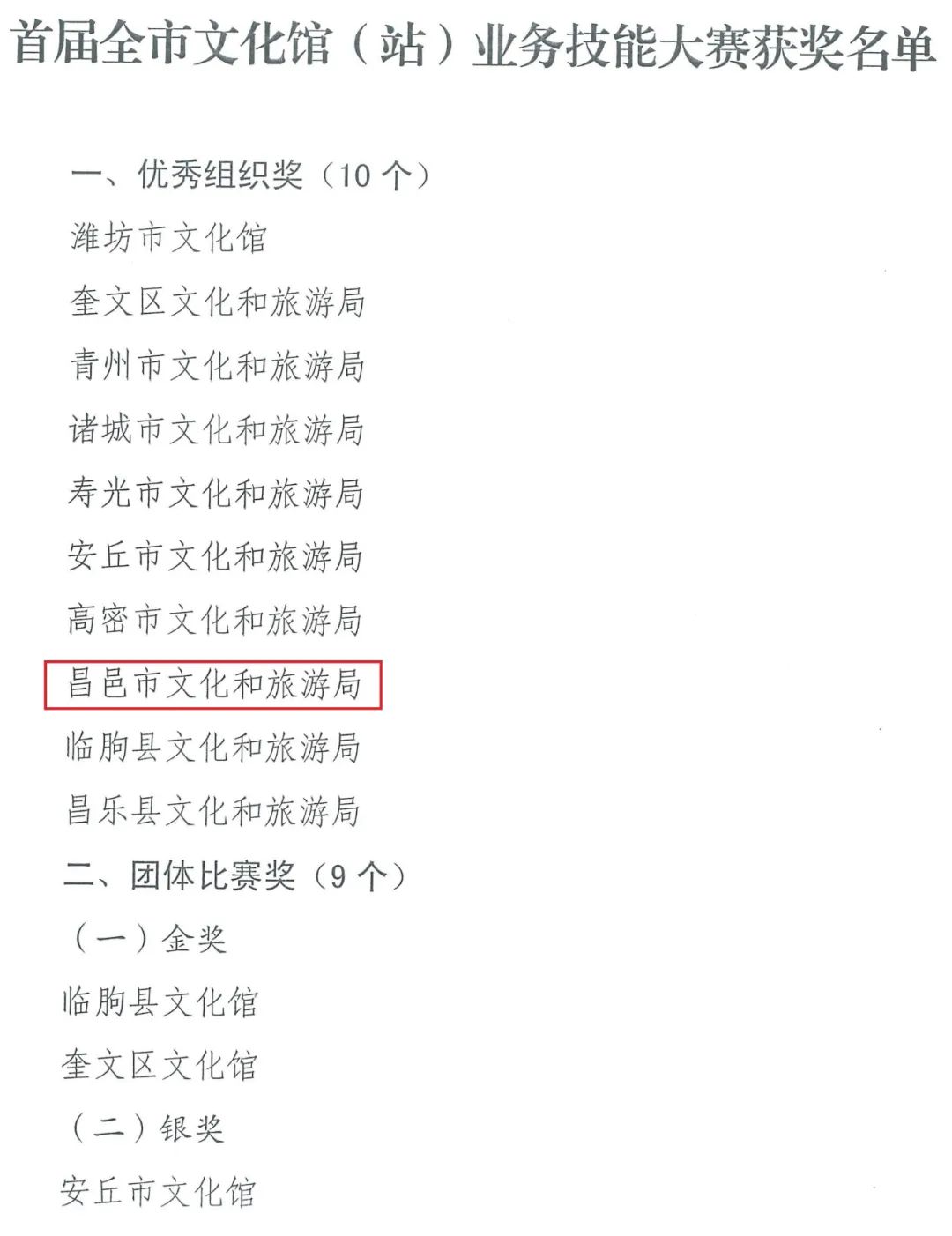 6月9日,潍坊市文化和旅游局公布首届全市文化馆(站)业务技能大赛获奖名单,昌邑市文化和旅游局获优秀组织奖,昌邑市文化馆获团体比赛银奖,来自昌邑市文化馆(站)业务人员荣获个人比赛类一等奖5名,二等奖7名,三等奖4名。