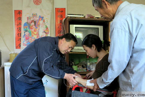 昌邑义长期关爱尹玉玲的事情经媒体报道后,好多市民获悉后纷纷为玉玲的病情而担忧。在全福元步行街开门诊的中医朱纯范作为一名义工,经常义务给贫困残疾病人推拿治疗,全福元步行街保安邵师傅从朱大夫口中知道了尹玉玲的病情,当即提出拿出自家的电子按摩治疗仪并委托朱大夫带给玉玲治病。义工们来到玉玲家,拿出慰问品和爱心款,玉玲又挨个和哥哥姐姐们对号,看看哪个是网上的什么名字。朱大夫拿出邵师傅提供的电子按摩仪一边在玉玲的穴位上包扎,一边给玉玲父女俩讲解使用方法。机器运行了,玉玲感受到了穴位的涌动,感受到了关节的变化。看到玉玲如此高兴,朱大夫不忍离去,又恳请大家等他一个小时,现场为玉玲进行了一次脉络推拿治疗。玉玲因为无法站立活动,父亲又忙着打工,双脚已经很长时间没有洗了,朱大夫认真的搓着她双脚上的穴位,没有一丝介意脚上搓下的灰垢。整整一个多小时的治疗结束了,玉玲脸上充满了笑容,大家鼓励她站一下试试,玉玲试着起身,又抬腿迈步,好久没有站立的玉玲竟然站起来了!掌声响彻农家小院,欢乐充满了沉寂已久的房子。朱大夫鼓励玉玲让父亲拉着到他的诊所治疗,并承诺免费给她治疗恢复,临走时又不放心在纸上给父女俩写上用仪器时各个穴位的按摩要领。