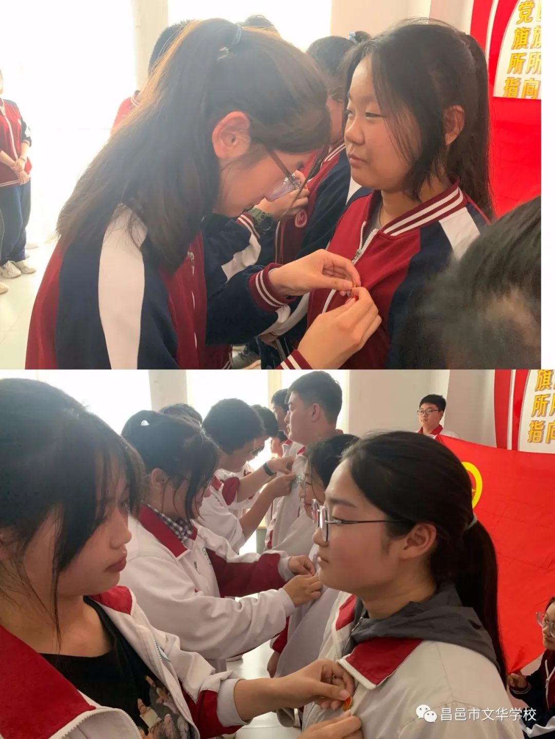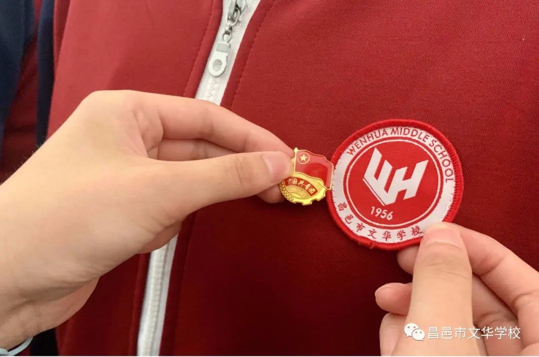 会议第二项议程,宣布本学期加入共青团的新团员名单,由老团员为新团员颁发团员证、佩戴团徽。
