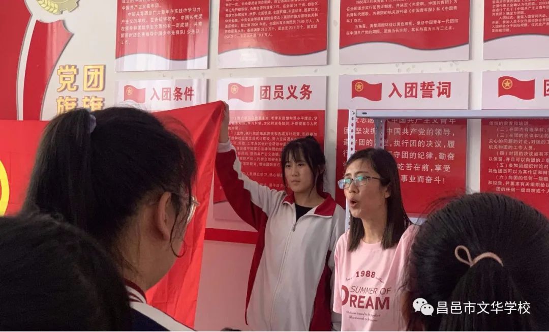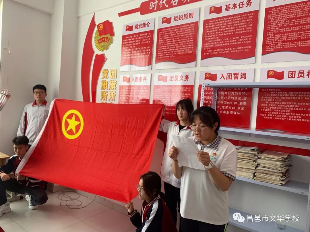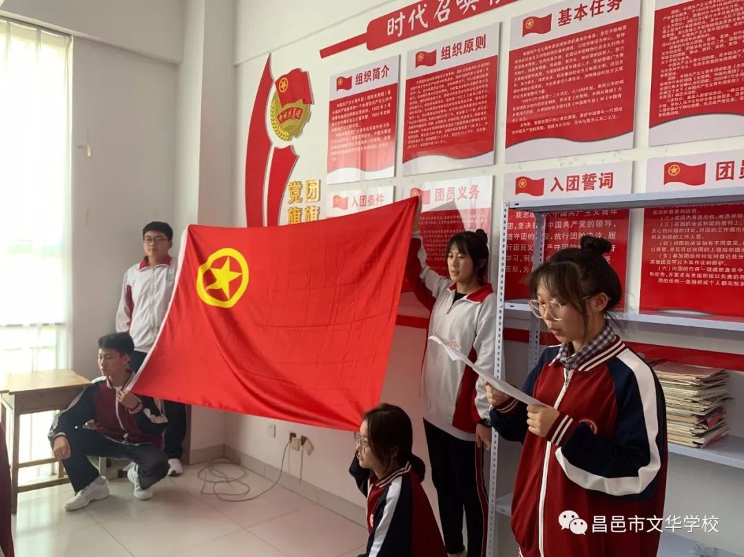 会议第三项议程,全体共青团员高举右拳,面对鲜艳的团旗,庄重进行入团宣誓。