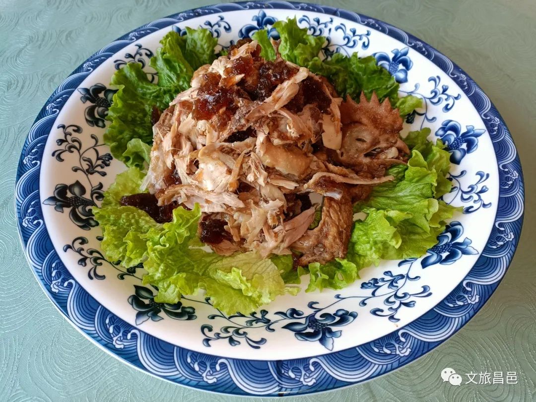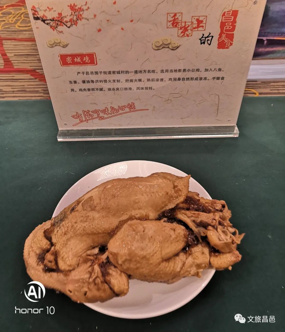 密城鸡是产于昌邑围子街道密城村的一道地方名吃,选用当地散养小公鸡,加入八角、生姜、酱油等调料慢火烹制,把握火候,熟后凉透,鸡周身自然形成凉冻。手撕食用,鸡肉香而不腻,凉冻爽口顺滑,风味独特。