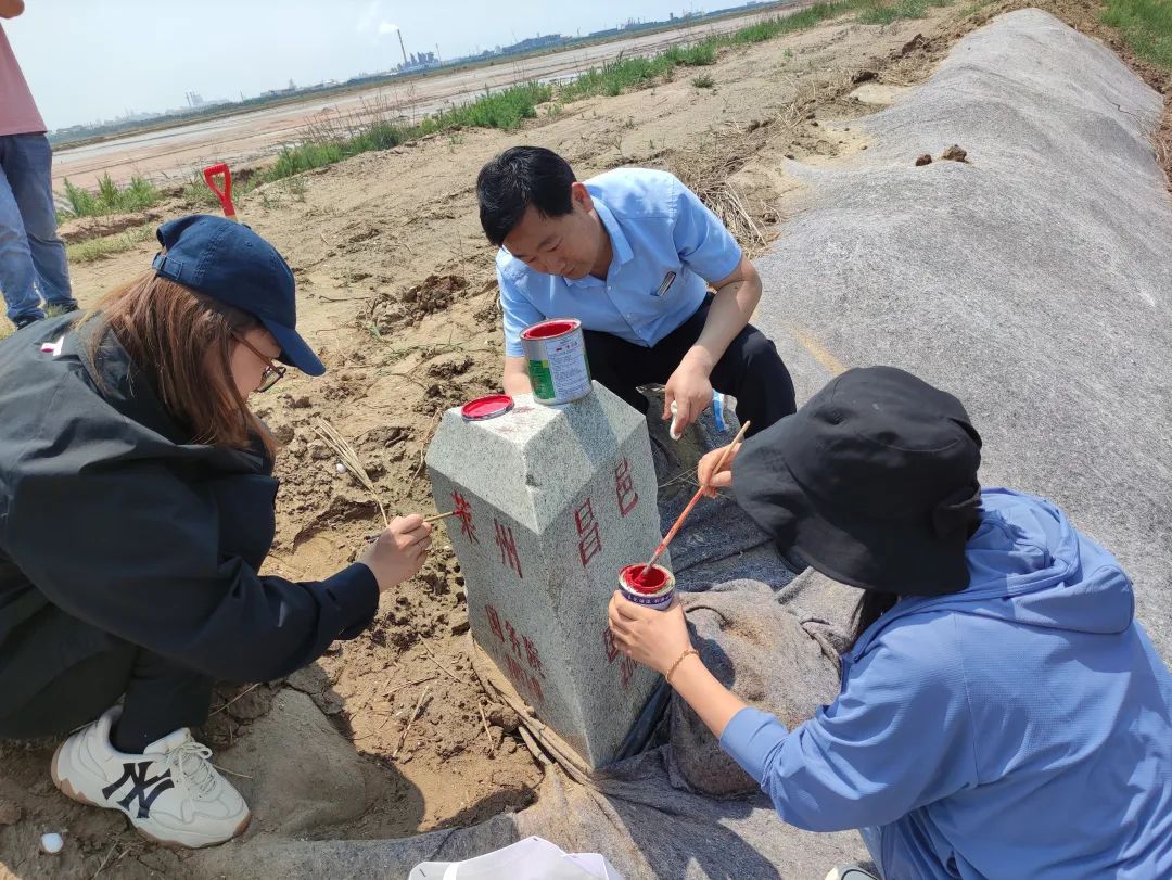 昌邑莱州边界线以胶莱河为界,全长18200米,共埋设界桩3棵。其中,平度、莱州、昌邑三市边界线交会点设三面型界桩1棵,入海口两侧设同号双立单面界桩2棵。在检查过程中,联检人员深入实地踏勘边界线,对界线两侧的地物、地貌进行认真核查,并对所埋设的界桩逐个检查,清除界桩周围的杂草及其它遮挡物,查看界桩是否有损坏和移动,用红漆对界桩上的文字进行重新描绘,确保界桩实地位置明显易找、庄严醒目。通过此次界线联检工作,进一步巩固了昌邑—莱州线界线勘界成果,加强了双方对行政区域界线的管理,推进了平安边界建设。