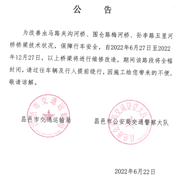 首页 行政动态 昌邑夹沟河桥、梅河桥、五里河桥维修改造公告 昌邑夹沟河桥、梅河桥、五里河桥维修改造公告 昌邑之窗 发布于 2022年6月23日 评论关闭 阅读(466) 昌邑夹沟河桥、梅河桥、五里河桥维修改造公告 为改善虫马路夹沟河桥、围仓路梅河桥、孙李路五里河桥桥梁技术状况,保障行车安全,自2022年6月27日至2022年12月27日,以上桥梁将进行维修改造,期间该路段将全幅封闭,请过往车辆及行人提前绕行,因施工给您带来的不便,敬请谅解。 昌邑市交通运输局 昌邑市交通警察大队 2022年6月22日