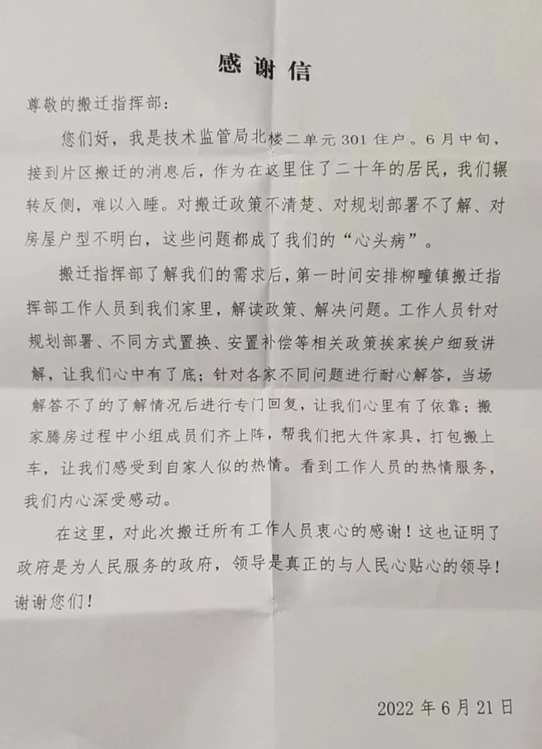 2022年6月21日晚,一封来自原汽车站片区二期的征迁居民张大妈的感谢信在柳疃镇征迁指挥部的微信群里流传开来。