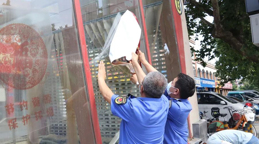 对沿街店铺陈旧对联、乱贴乱画、乱扯乱挂等进行清理。