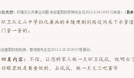 就环卫工作性质,本应该值得社会尊重,但随便认定别人眼里环卫就是“臭要饭的”,实为侮辱环卫工人,回复此信者若是环卫内部人员,那就是侮辱自己的下属;如果是非环卫人员,那就是侮辱环卫队伍,尽管环卫队伍中还是出现了乱倒粪便等让人遗憾的事情。