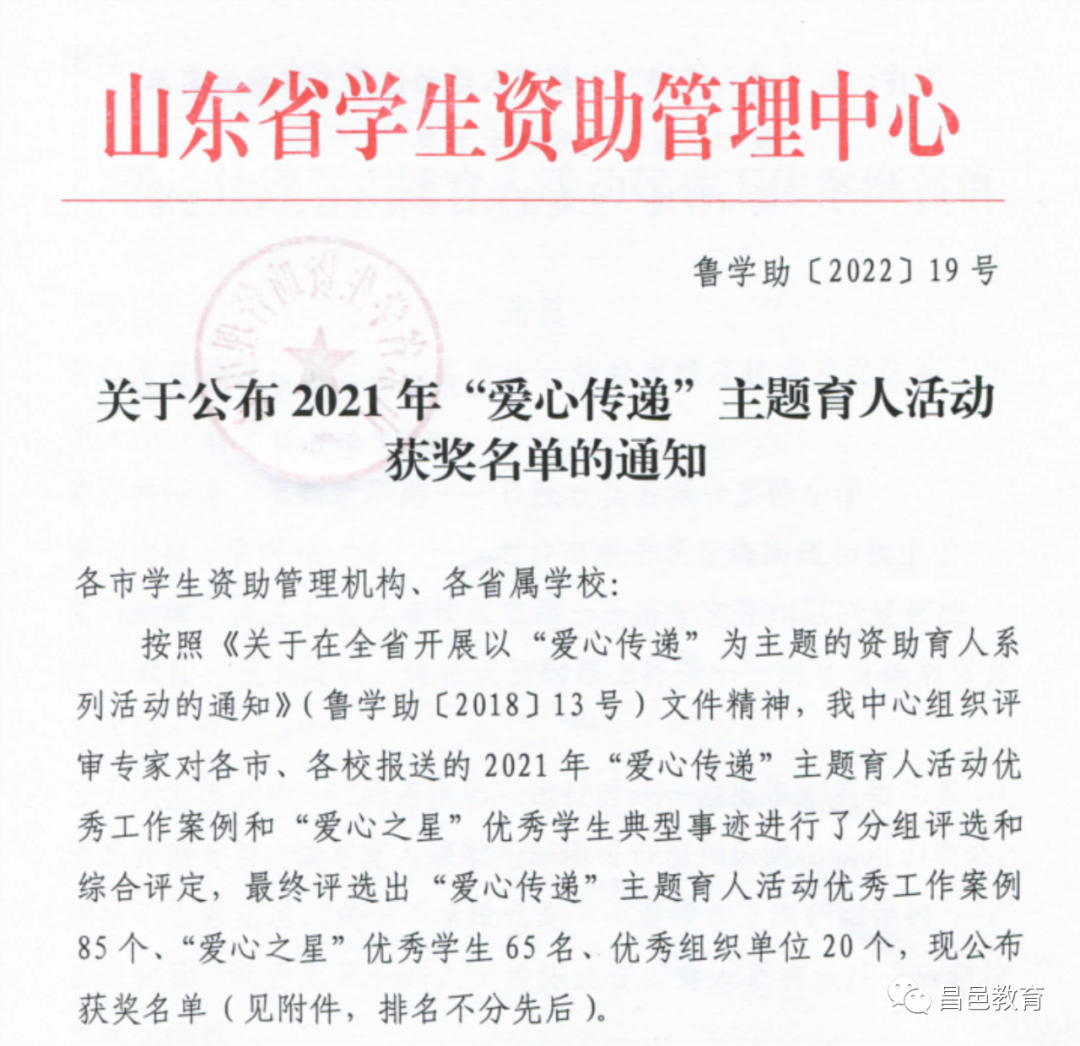 近日,山东省学生资助管理中心公布2021年“爱心传递”主题育人活动获奖名单,昌邑市3项案例获评全省优秀工作案例,居潍坊市各县市区之首。