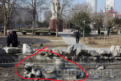 红线圈出的雕塑已经被人推倒在湖中,只留下了孤零零的园底座。