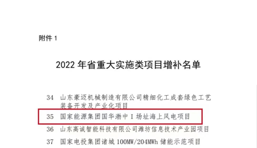 近日,山东省发改委以鲁发改重点〔2022〕543号文件下发《关于印发2022年省重大项目调整名单的通知》,我市国家能源集团国华渤中I场址海上风电项目增补为2022年省重大项目。
