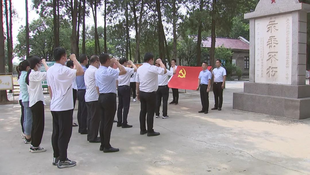 在烈士纪念碑前,全体党员面向党旗,高举右拳,重温入党誓词。铮铮誓言,铿锵有力,彰显了牢记初心使命、永远拼搏奋斗的信念与决心。