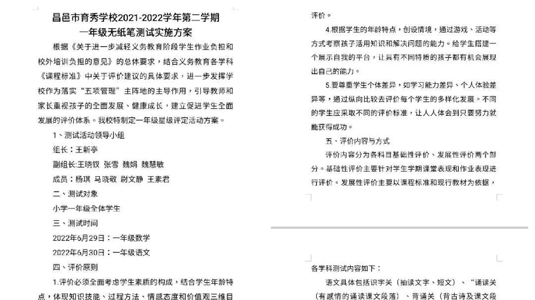 首页 新闻动态 昌邑市育秀学校举行一年级无纸笔测试活动 昌邑市育秀学校举行一年级无纸笔测试活动 昌邑之窗 发布于 2022年7月3日 评论关闭 阅读(997) 昌邑市育秀学校为贯彻落实国家“双减”政策及教育部《关于加强义务教育学校考试管理的通知》文件精神,提升学生综合素养,加深学生实践体验,促进学生全面发展,昌邑市育秀学校积极探索“双减”背景下核心素养导向的学业水平测评方式,6月29日-30日,举行了一年级无纸笔测评活动。 制定方案 学校领导高度重视、积极筹备,成立领导小组,多次召开研讨会,制定实施方案,商议相应细则。结合教材、学情、校情设计学生学习评价内容及标准,从学生本位出发,过程性+综合性双边结合,以趣味闯关的方式,指向学科核心素养进行评价,真正实现减负提质。 分科测试 没有试卷,不用纸笔 一道道有趣的关卡 早已让孩子们摩拳擦掌,跃跃欲试 让我们跟随他们的步伐 去一探究竟吧! 趣味数学 数学测试有四个关卡,分别为“口算关——我是小小神算手 ”、“辨认关——火眼金睛识朋友”、“思维关——说理解题我最棒”、“实践关——巧思妙想我能行”,让学生在巩固基础知识的同时,学会对知识的灵活运用,培养思维能力、表达能力、分析与解决问题的能力。 瞧!孩子们手持闯关卡,认真作答的模样,连“考官”都不由自主地为他们点赞! 智慧语文 语文测试分为“识字关——字正腔圆”、“诵读关——声情并茂”、“背诵关——触目成诵”、“表达关——出口成章”四个关卡。学生们进入闯关室随机抽题,徜徉在游戏闯关中,期待着自己用良好的表现赢得每一关的五颗星,个个脸上洋溢着灿烂的笑容。 “耶,闯关成功啦!”孩子们激动地欢呼着。一枚枚灵动的印章记载着他们通关的喜悦。 本次活动给学生搭建了全面发展的平台,整个闯关过程既充满挑战又饱含趣味,乐学、乐思、乐测、乐在其中,让学生在“学中玩,玩中考”,既减“负”,又提“质”、增“趣”。