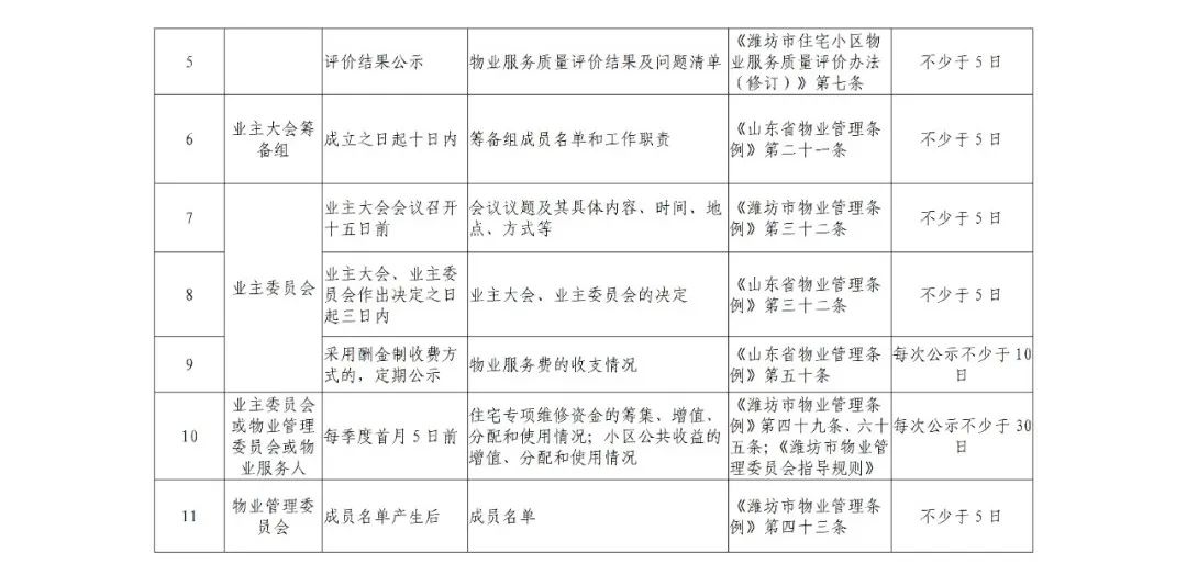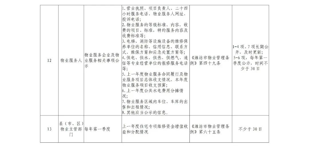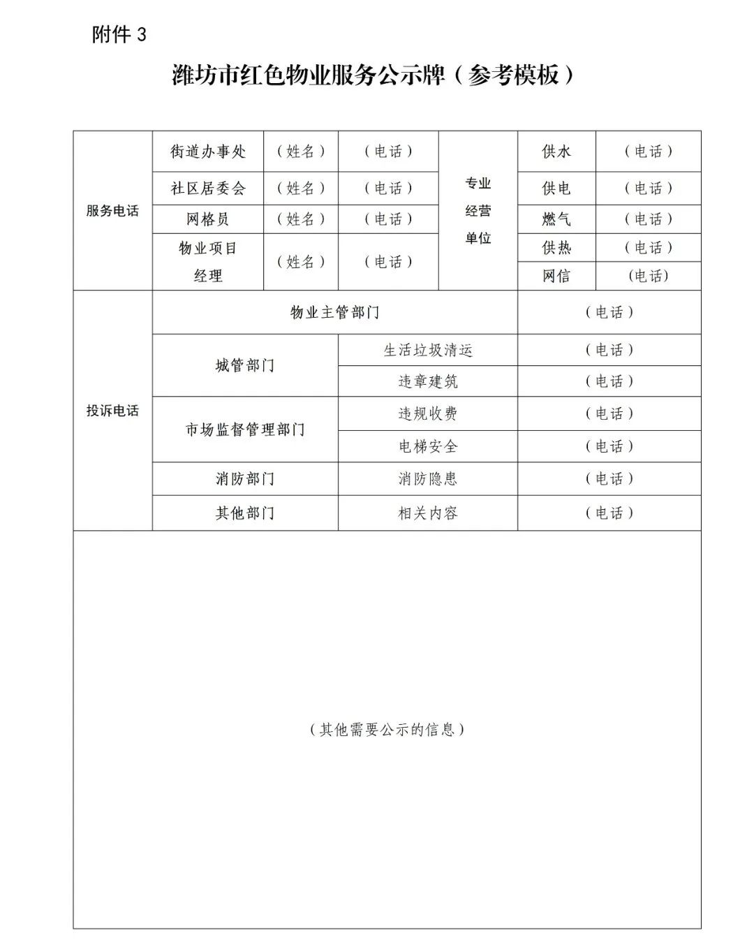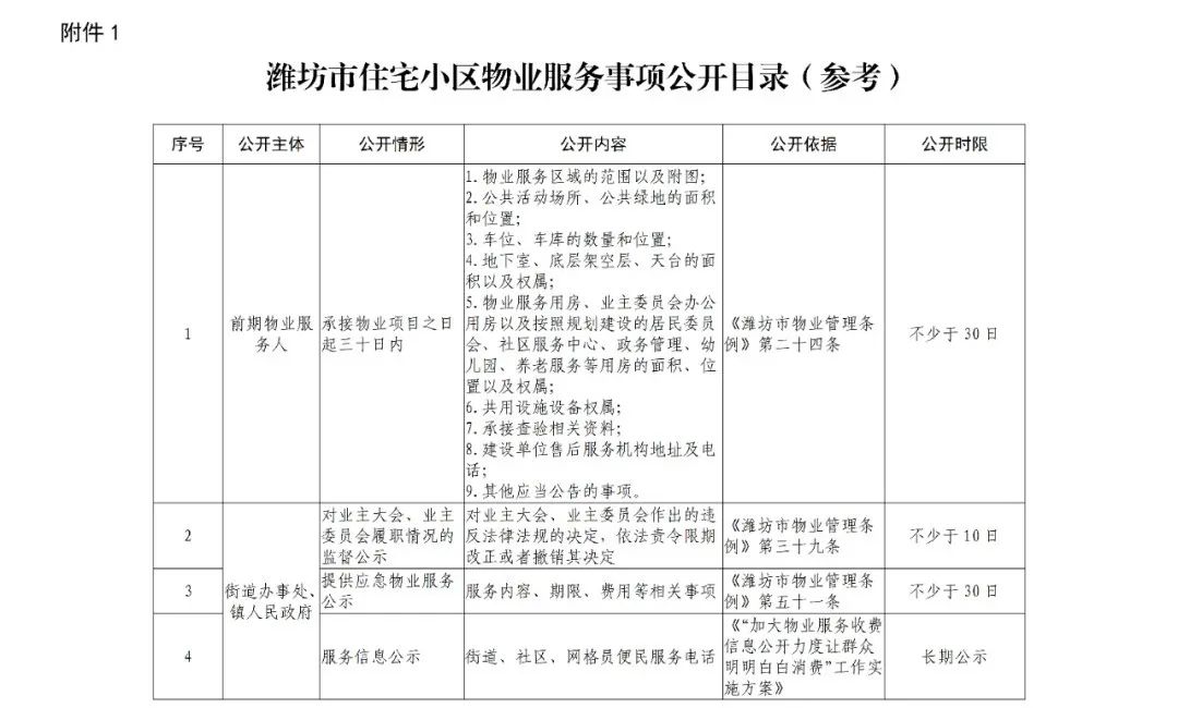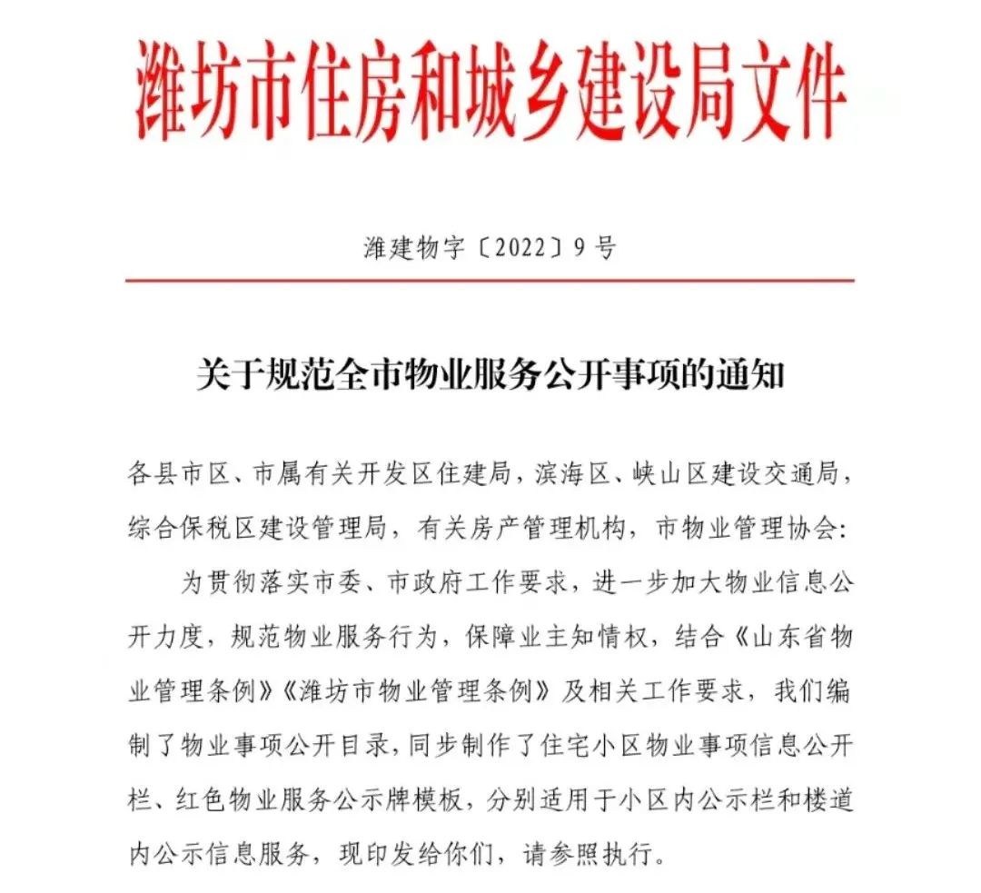 首页 行政动态 昌邑关于规范全市物业服务公开事项的通知 昌邑关于规范全市物业服务公开事项的通知 昌邑之窗 发布于 2022年7月3日 评论关闭 阅读(584) 各县市区、市属有关开发区住建局,滨海区、峡山区建设交通局,综合保税区建设管理局,有关房产管理机构,市物业管理协会: 为贯彻落实市委、市政府工作要求,进一步加大物业信息公开力度,规范物业服务行为,保障业主知情权,结合《山东省物业管理条例》《潍坊市物业管理条例》及相关工作要求,我们编制了物业事项公开目录,同步制作了住宅小区物业事项信息公开栏、红色物业服务公示牌模板,分别适用于小区内公示栏和楼道内公示信息服务,现印发给你们,请参照执行。 附件: 1.潍坊市住宅小区物业服务事项公开目录(参考) 2.潍坊市住宅小区物业服务信息公开栏(参考模板) 3.潍坊市红色物业服务公示牌(参考模板) 潍坊市住房和城乡建设局 2022年6月27日 文中附件,请扫描上方二维码进行下载