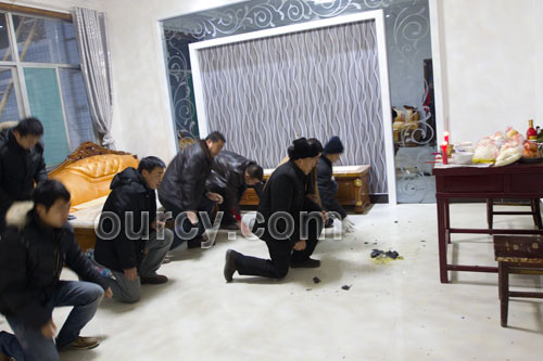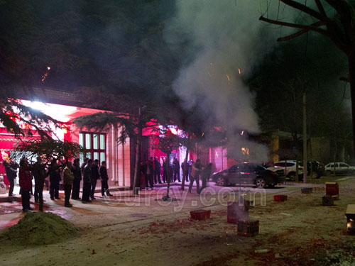 村中老人们和我们深情地聊着过去,聊着村子的历史,不觉两个小时过去了,我们和道上的乡亲们道别,回到英长林家吃团圆饭。英长林的父亲英秀山老人今年已经八十三岁了,他指着家堂前摆着的一位女性老人的照片说:“这是我的母亲,他娘家是从山东昌邑老匙沟迁徙过来的,我姥爷为了纪念老家,给我舅舅起名叫‘昌邑’,而我父亲因为我出生在陕西,给我起(乳)名叫‘西安’。”老爷子又说:“老家的人过年到陕西来,我很感动,老家没忘了我们。”然后又吩咐儿子去买烟花庆祝。老人把儿孙四代四十多人都叫来和我们团聚,和家乡人交流。晚饭时,他们不但给我们做了地道的昌邑菜,还给我们上了几道陕西菜。席间,老人讲,这里当地的人年初一都是八点多才起来,没有一点年景,而我们昌邑村,半夜发码子,整个下半夜都在串门拜年磕头祭祖。每到年夜,周围的陕西当地村庄都在等待着看昌邑村的年景,听昌邑村的鞭炮齐鸣。我们的年景,已经成了当地的一大风景。甚至周围村子中的孩子都嚷着要到山东庄的同学家里去过年,去感受那份年味十足的年夜习俗。我们和英家老少吃饭团圆饭,他们门前已经摆好了十几箱子烟花,小孩们燃放着“嘀嗒筋”,大人们点上了烟花礼炮。礼炮映红了夜空,映红了村子,映红了乡亲们节日的笑脸。