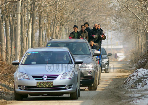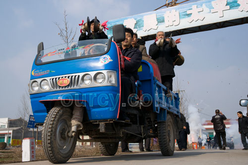 敲着锣鼓的车队迎接我们进村,从乡亲们的笑容中,我们感受到了浓浓的乡情。