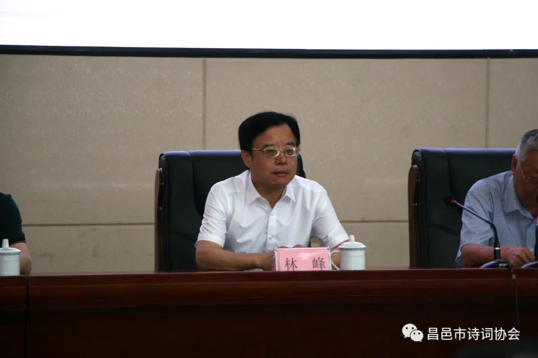主席台就坐的人员:中华诗词学会副会长、中华诗词杂志社副主编林峰、山东诗词学会副会长兼秘书长孙义福、潍坊市政协原副主席刘树亮、昌邑市政协主席李明杰、昌邑市政协副主席孙永涛