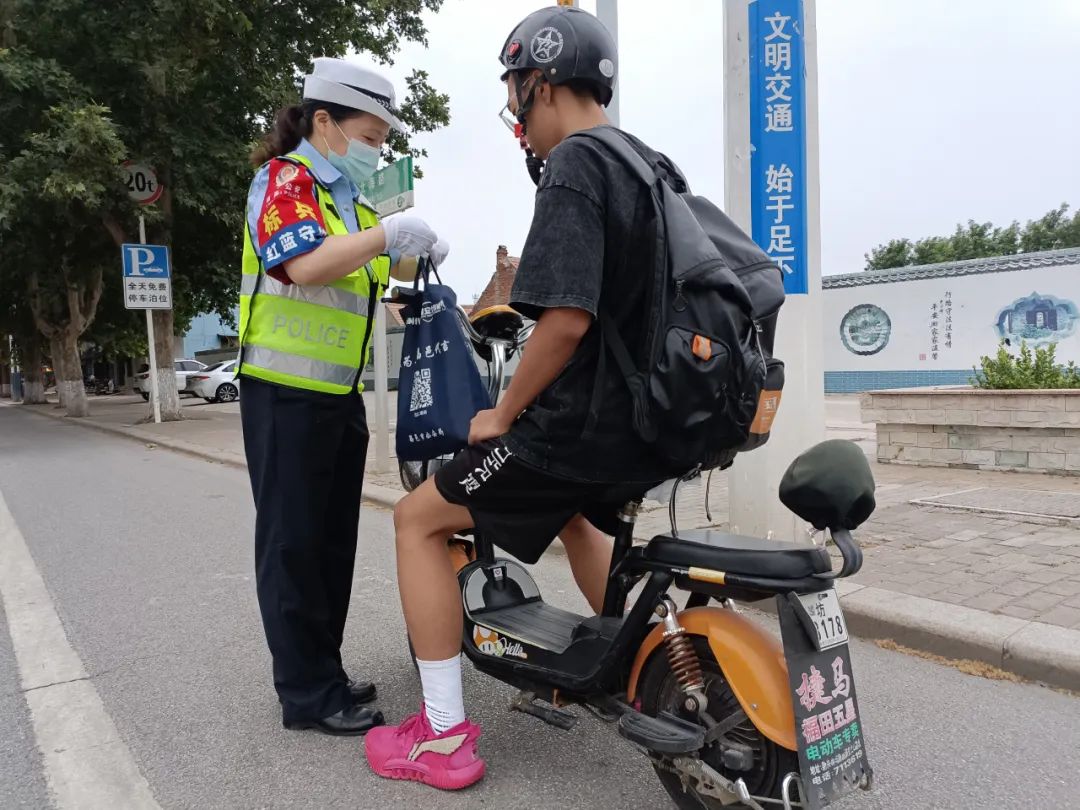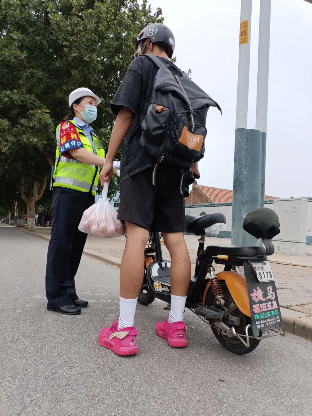 图中这位少年一手骑着电动车,一手提着一袋鸡蛋,如耍杂技一般由远及近时。那位交警姐姐连忙“小心翼翼”的示意停下,告诉孩子这样做很危险很危险!