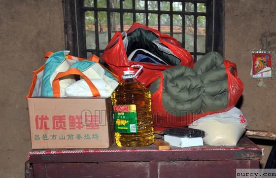 义工和爱心记者们送给老人的保暖用衣被及生活用品堆满了桌子