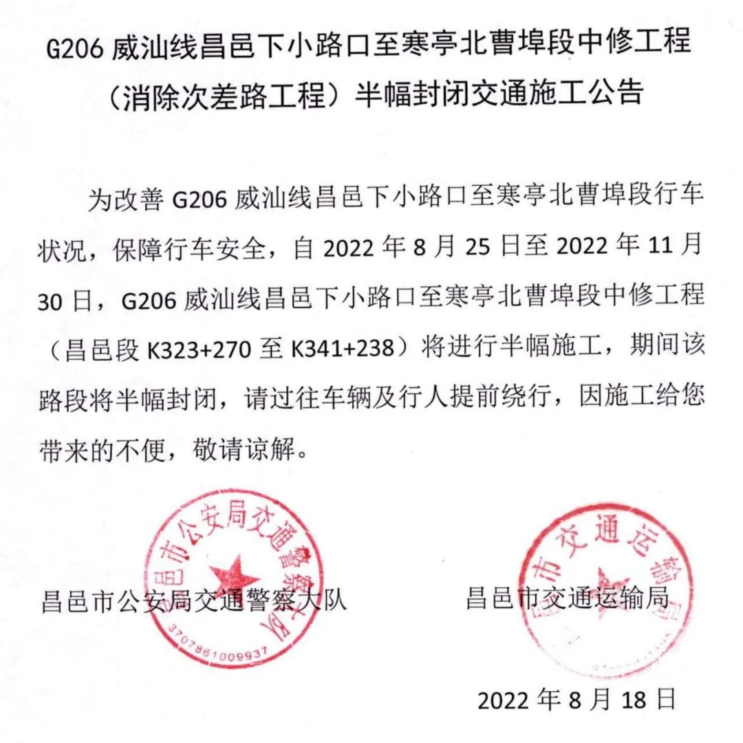 首页 行政动态 G206国道威汕线昌邑下小路口至寒亭北曹埠段中修工程半幅封闭公告 G206国道威汕线昌邑下小路口至寒亭北曹埠段中修工程半幅封闭公告 昌邑之窗 发布于 2022年8月18日 评论关闭 阅读(2652) G206国道威汕线昌邑下小路口至寒亭北曹埠段中修工程(消除次差路工程)半幅封闭交通施工公告为改善G206威汕线昌邑下小路口至寒亭北曹埠段行车状况,保障行车安全,自2022年8月25日至2022年11月30日,该段(昌邑段K323+270至K341+238)进行半幅封闭施工。