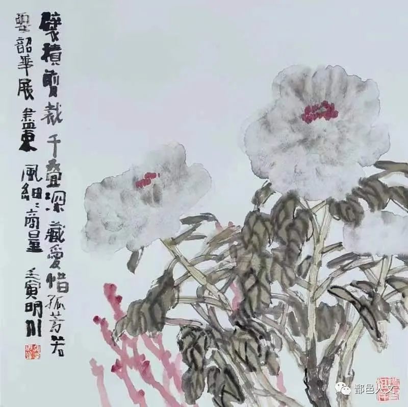 我最喜欢的,还是他的牡丹。我说:张哥,你画的牡丹怎么和别人不一样呢,没有脂粉气,连枝蔓都支棱着,透着一股咱昌邑男人的霸气!不过近来我看张明川的牡丹,画的越来越简单了。画面说不出的素静。构图简洁,用笔着墨也少了,美在天然平淡,无意于佳乃佳,可能和他现在恬适的心态有关了。早前我跟他求过一副牡丹,上面题的是康熙皇帝的诗:晓雨疏疏薄洒,午风习习轻吹。忽念畅春花事,正当万朵开时。霸道的牡丹花和御制诗相得益彰。我把它裱好,挂在客厅里,心想咱也沾点皇家气象。有一点点霸气、有一点点素雅,还不失雍容华贵,我想这就是明川牡丹的特质吧。张明川主张艺术创作要反映时代精神。我的理解,这和“文章合为时而著,歌诗合为事而作”是一个道理,无论是艺术家还是文学家,都要关注时代命题,为时代而写作。记得有一年的潍坊中国画节,张明川把多年来创作的军舰飞机,“开”进鲁台国际会展中心,大气磅礴的军事主题创作,让人震撼,让全国美术界瞩目。这是一个艺术家的情怀和担当。