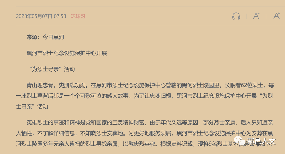 昨天,环球网刊登黑龙江省黑河市9名烈士信息,寻找烈士亲属。其中有一名叫“荣雅轩”的烈士在列,显示信息“山东昌邑”,望各位热心市民协助查找联系。如下是该烈士详细信息:姓名:荣雅轩籍贯:山东昌邑出生日期:1922牺牲日期:1946牺牲地:爱辉区二站安葬地:黑河烈士陵园事迹:属黑河军分区,时任排长。1946年6月,随王肃司令员从省城北安开会返回途中,行至二站时遭到土匪袭击,激战中壮烈牺牲,年仅24岁。寻山东昌邑籍烈士荣雅轩亲属