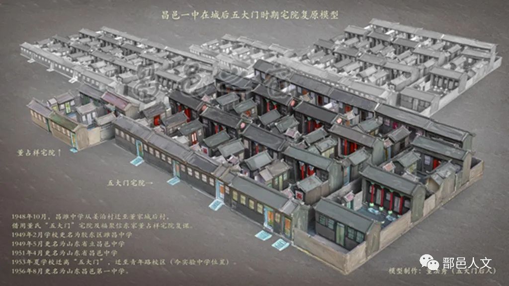 近日,董家城后村董法秀老人完成了昌邑一中上世纪五十年代初在董家城后村办学时的校舍模型。董老先生是城后“五大门”的后人,自小记得学校在家族宅院办学时的情境,虽然宅院早已拆除,但是老人一直有一个心愿,就是把当年办学的宅院复原。今年春节后,他利用附房里的废旧泡沫板和孙辈的画笔颜料,耗时数月,完成了“五大门”及其它当年校舍的模型复原,为我们了解当年那段办学历史提供了最直观的素材。