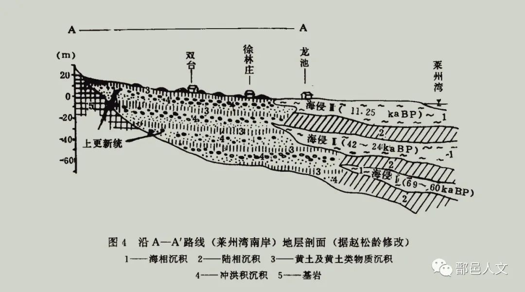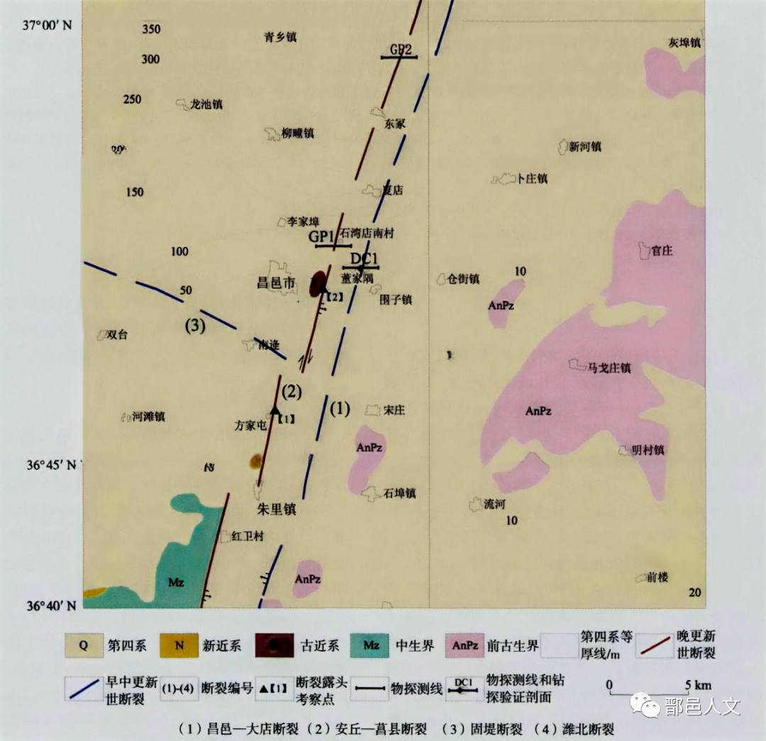 昌北地层结构海岸线北移到了大约 1.1 万年前,地球进入较为温暖的间冰期,海平面重新上升,逐渐形成了我们今天看到的渤海。商周时期的昌邑古海岸线本在今天的新海路(原新沙公路)附近,但潍河从上游带下来的泥沙流淌到昌北平原,因水流变缓而沉积下来,又因河床抬高而频繁变道,不但垫高了昌北土层,还导致海岸线向北延伸。昌北断裂带昌邑境内黄土层下埋藏着两条大的地震断裂带。其中,安丘—莒县断裂昌邑延伸段主要经寒亭朱里方家屯村东、文山东坡 、石湾店(南村)西、下营镇后柳村东等地,属晚更新世活动断裂;昌邑—大店断裂作为郯庐断裂带东地堑的东侧边界断裂,也是潍北凹陷与鲁东隆起的分界断裂,主要经饮马青龙山西侧、石埠青山西侧、围子街道董家隅村东、下营镇西营村东,向北与安丘—莒县断裂交会,属于早中更新世活动断裂。