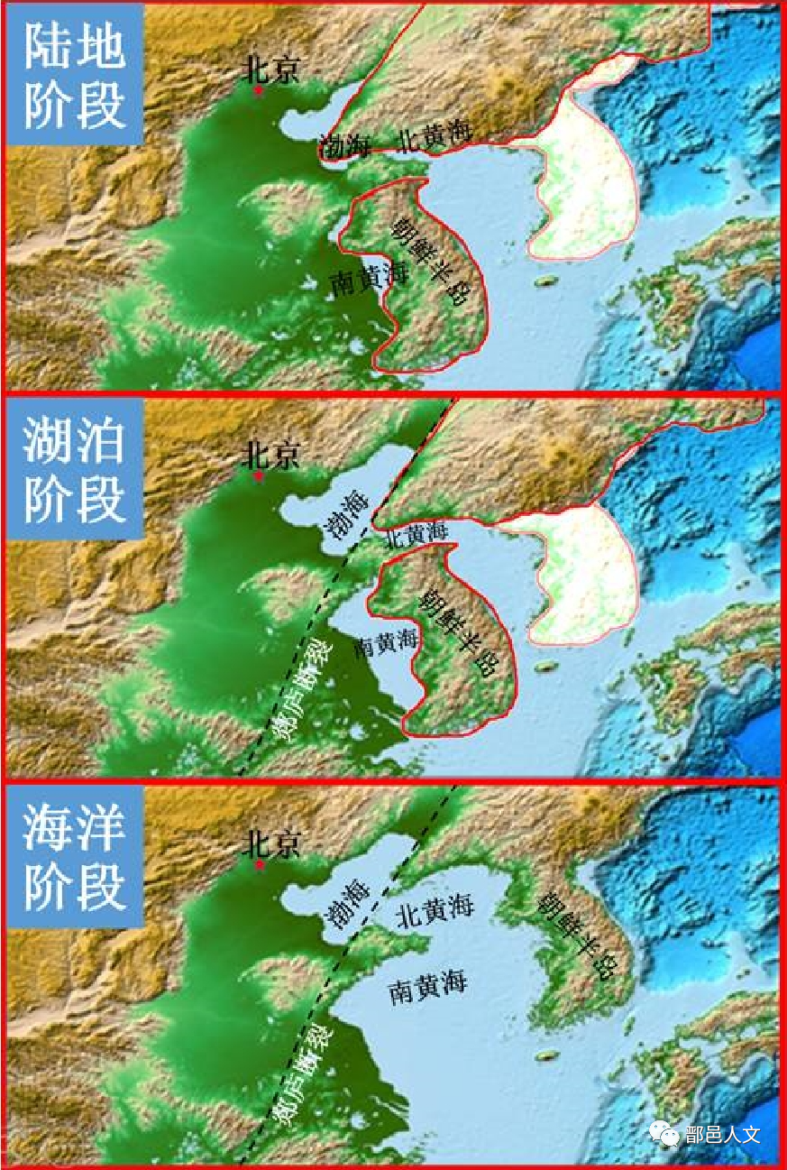 2亿年前的中国古陆2亿年前,羌塘陆块已经和中国古陆融合,拉萨陆块基本在中国古陆的正南方,但离中国古陆已经很近。因为受到羌塘陆块的积压,青藏高原部分形成。在该时期,酸雨得到中和,植物又一次焕发生机,躲过二叠纪灭绝的爬行动物进化成了恐龙。但陆生动物鱼龙却生出鱼鳍,回到了海洋。昌北平原古地层形成1.7亿年前,受太平洋板块的俯冲挤压作用,太行山脉隆起。蒙古陆块并入中国古陆。此时的华北陆块已经再次抬高四千余年,并在今后的相当长一段时间保持大面积露出海面,繁盛的植被为华北大陆后来形成的煤层积累了充足的原料。1.3亿年前,中国古陆进入了造山运动活跃期。胶东古陆的招远一带因地壳深层岩上涌重熔而形成金矿地层。昌邑青山一带岩体也在该次造山运动中发生了再次重熔和抬升,形成了今天的青山山体。自约9000万年前开始,因西部陆块对中国大陆的持续挤压,导致华北地体东移,山东至胶辽陆块南北向拉伸,朝韩陆块裂解东移,渤海盆地形成。此后的数千万年中,昌邑北部及渤海区域经历了三起三落,并最终形成了今天的渤海湾和昌北平原。