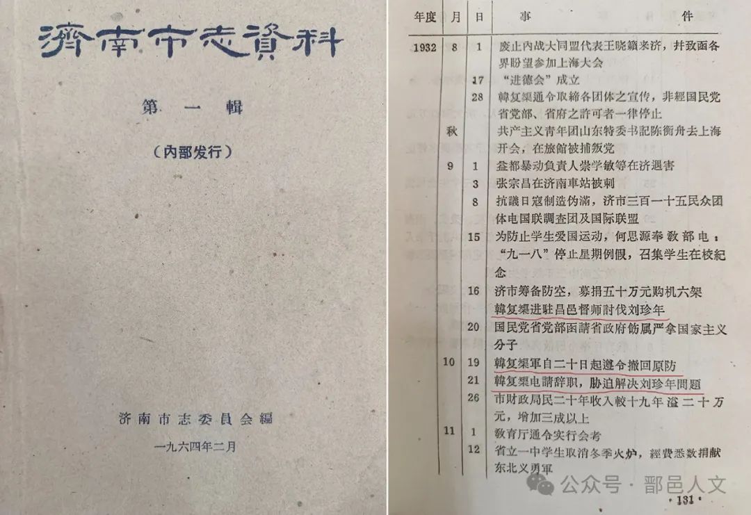 近日,在济南市图书馆查阅资料,从一本泛黄的《济南市志资料》中,偶然发现大事记一栏载有:“1932年9月16日,韩复榘进驻昌邑,督师讨伐刘珍年”。