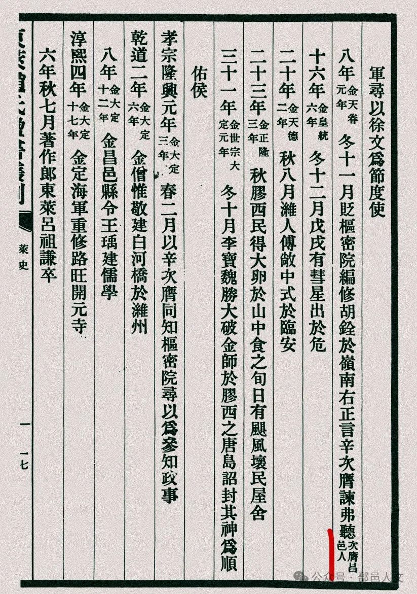 《莱史》中辛次膺的籍贯记录辛次膺(1092一1170),字起季,昌邑县人(《莱史》载),南宋名臣。政和二年(1112年)登进士第,授单父县丞。宋高宗绍兴年间,左正言,主张抗金,力斥和议。除直秘阁、湖南提刑,为秦桧所陷,奉祠十八年。秦桧死后,起知婺州。绍兴二十七年(1157年),试给事中。宋孝宗即位,拜御史中丞。隆兴元年(1163年),同知枢密院事又拜参知政事,以疾力辞。隆兴二年(1164年),以资政殿学士、提举洞雪宫致仕。乾道六年(1170年)卒,年七十九,谥简穆。辛次膺一生为官清正,敢于直言。善属文,尤工诗。著有《属辞比事》5卷、《奏疏》10卷、《笺表》10卷。浦城平叛获重任南宋初立,宰相呂頤浩“以次膺宰浦城,遏賊沖”(《宋史·列傳》第一百四十二)。未曾领军作战的辛次膺到达浦城后,带领百姓清除叛民焚余,重整损毁城垣。经与乡民了解叛乱起因,随后张榜帖文以止住谣言,安抚百姓情绪,并申明朝廷之意,择丁壮以守卫民舍。数月后,叛军余党攻破邻邑,浦城百姓再次惊恐。福建主帅建议辛次膺守城以待援军。辛次膺分析敌我形势以后,招募擅弩乡兵,出城伏于河侧,待叛军至,千箭齐发,叛军溃散。辛次膺率军追击,再次大获全胜。他惩治了为首五人,对其余叛军全部宽宥,浦城自此安定。