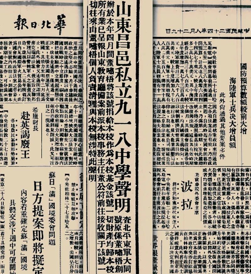 据1935年8月29日《华北日报》刊载:“山东昌邑私立九一八中学声明——查北平东单大同号原系董啸梧(廷梅)创办,于本年四月间,董啸梧将该号捐给本校作为本校基金。该号一切财产均归本校所有,业已呈报山东教育厅备案前,派本校事务主任董公符前往接收。关于该号一切往来,由董啸梧个人负责清理,与本校无涉。特此声明!”1935年秋后,学校经费告紧,开支发生困难,董廷梅只得四处求借。后来,身边的亲戚朋友全借到了,仍无济于事,他只好寄希望于哈尔滨的亲友。据李建民回忆:“当时我姥爷作为日本人的通缉犯,无法回到哈尔滨,就让我三姥爷董廷璋带着他的亲笔信去哈尔滨找一位故交,他按照信上的街道门牌号很快找到了那里,却见大门口已换上了日本宪兵队的牌子,两边还有日本兵站岗。三姥爷见状赶紧示意黄包车夫不要停车,迅速离开这是非之地,空手而归。”年关在即,学校经费亏空,已无法运转,董廷梅费尽心思,东挪西借,凑足外地聘请教师的路费,学生放假,学校关停。