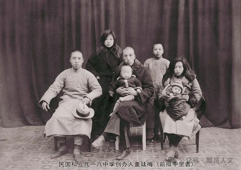 主人公董廷梅在那个风雨飘摇的年代,凭借个人经商积蓄和社会募捐,于1934年在昌邑文山之巅创办了一所中学,命名“昌邑私立九一八中学”。翌年正月开学,招生三百余人,这是昌邑教育史上第二所中学。文章对学校的办学过程、校园布局、师生情况、教学内容等都有详细描写,但由于作者当时是一名普通学生,对办学人董廷梅先生的身世知之甚少,只做了简要的描述。于是,我的脑海里浮现出一连串的问号:董廷梅先生的身世和家庭背景如何?他在办学前后又经历了些什么?我查阅资料、寻访师友,收效甚微。困惑之际,突然收到一手机信息:“我是董廷梅的曾孙女董丹丹,前些天搬家时发现了一张老照片,是老爷爷董廷梅的家庭合影。”我喜出望外,立即邀约在市博物馆见面。博物馆工作人员对这张泛黄残缺的珍贵老照片进行高清扫描并存档,摄协李发宁主席做了技术修复。通过座谈,了解到董廷梅身世和后人的基本情况。