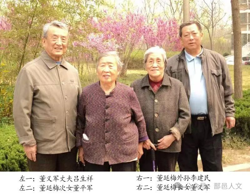 现存这张董廷梅唯一的家庭合影,据其后人辨认,前排中间是董廷梅,他怀抱的幼儿是董勇军(董正良),左一为其三弟董廷璋,右一是其二夫人李竹萍,襁褓中的婴儿是董血军(董正善)。后排左一是其三夫人赵颖美,右一是其四弟董廷玕。
