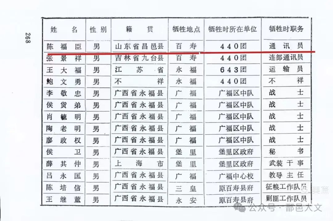 自1950年,中国人民解放军第49军147师440团在广西桂林永福县一带剿匪,历时一年余。期间,440团近百位烈士长眠于永福。其中,有一位名“陈福臣”的昌邑籍烈士。