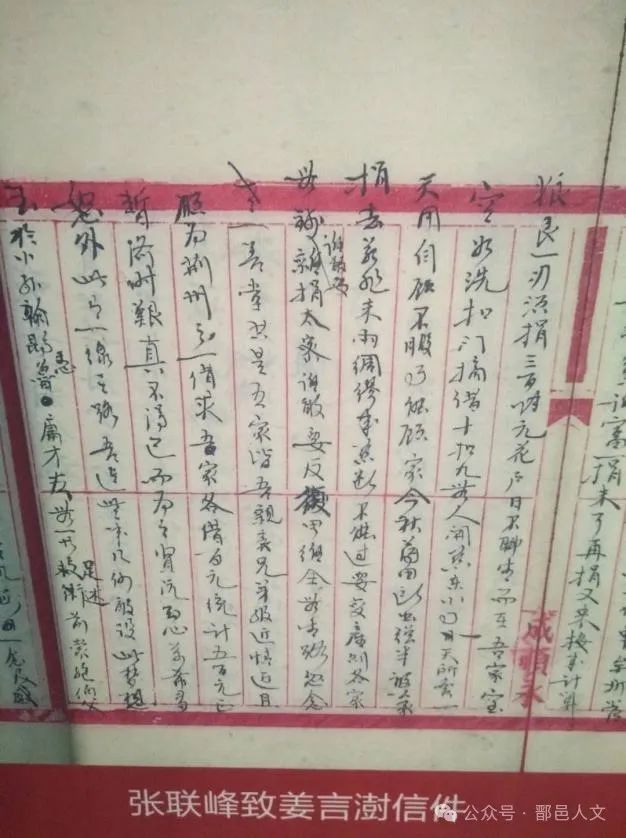 在姜泊村史馆内,有一封张联峰先生致姜言澍信稿复印件,因原稿字体潦草,令人难以卒读。为方便广大参观者能识别信稿中的文字,近来,我将其进行初步识读并加注释,但仍有多处难以确定,望方家阅后多提意见为感。