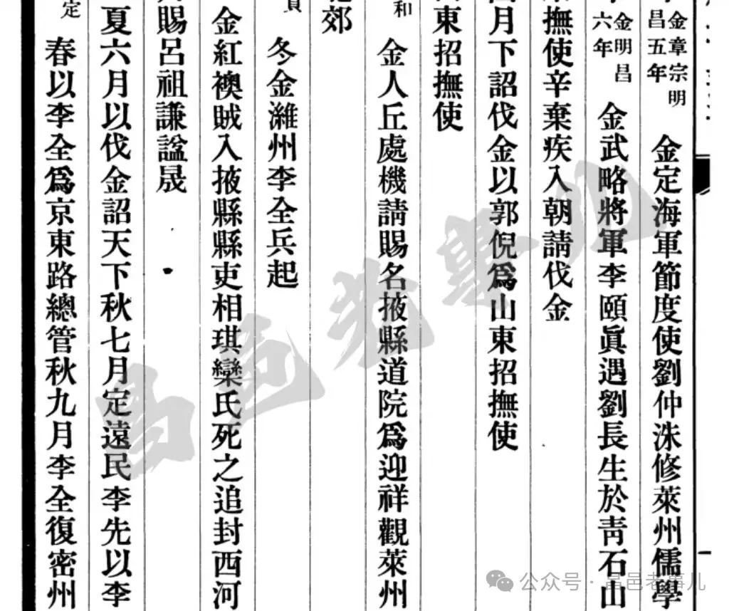 金章宗执政后期,正是宋金对峙、蒙古南侵之际,山东各地民众借机起义,益都(今青州)人杨安儿举兵抗金。金宣宗贞祐二年(1214)腊月,潍州北海(今潍坊)人李全响应起兵反金,因弓马娴熟、善用铁枪,人称“李铁枪”。史载其“群聚为盗,寇掠州郡,皆衣红纳袄以相识,时目为红袄贼”,起义者以红袄为标记,故名“红袄军”。随着红袄军的势力日渐壮大,席卷周边各县。他们最初主要在潍州、临朐、安丘一带活动,昌邑属潍州管辖,亦遭到大肆抢掠,并将县城西北隅之玉真观付之一炬,主体建筑被焚毁殆尽,史称“贞祐兵燹”。