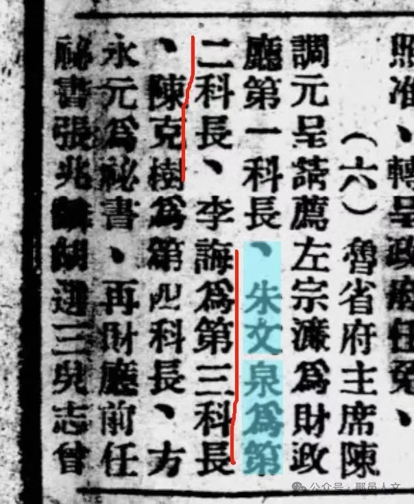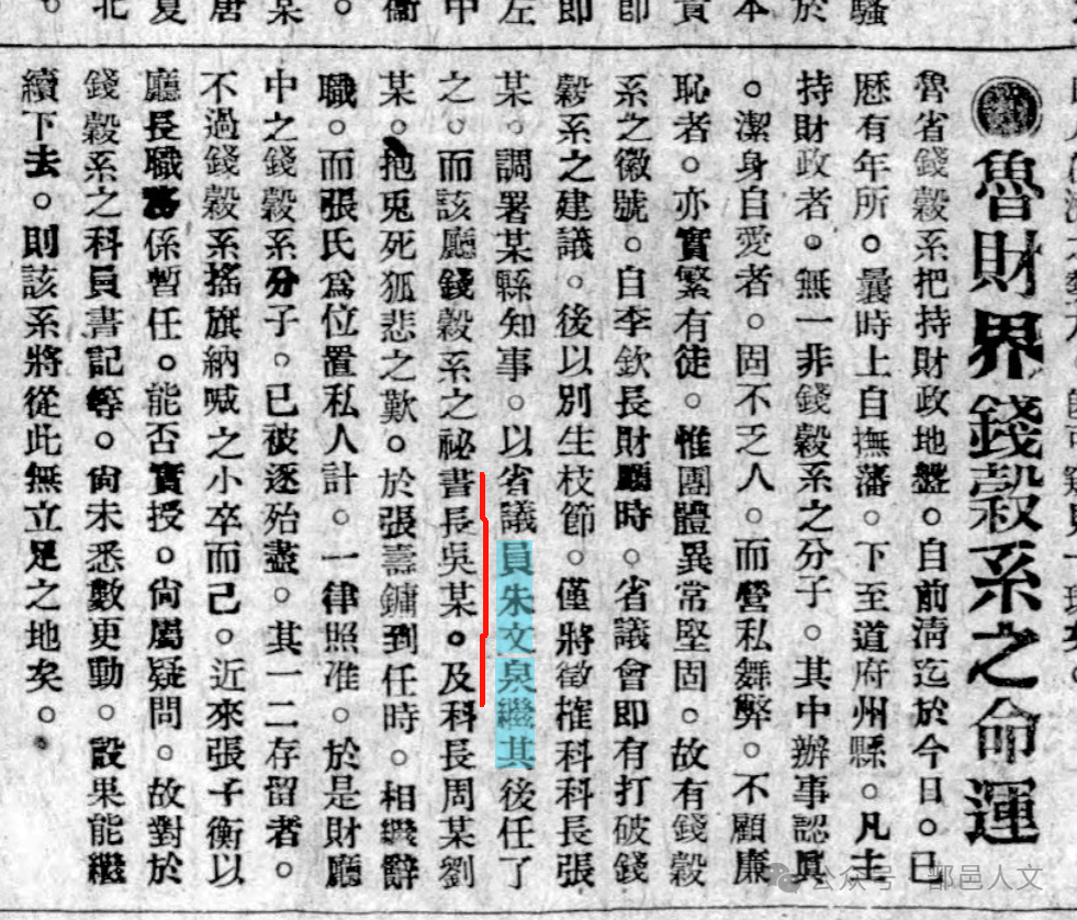 李发宁先生费尽周折查到了部分珍贵资料,使朱文泉在财政厅的职业经历渐次明晰。据某报《鲁财界钱谷系之命运》载:“自李钦长财厅时,省议会即有打破钱谷系之建议,后以别生枝节,仅将征榷科科长张某调署某县知事,以省议员朱文泉继其后任了之。”据查,李钦任职山东省财政厅厅长的时间是1918年12月3日至1920年10月7日。另有资料表明,“龚积柄护理山东省长后,即将随熊(炳琦)去职之人员(职位)一律更换其私人,如卷烟税坐办吴锡永兼省署秘书长,财政厅秘书长朱文泉兼省署财政科长……”经查,龚积柄曾于1921年8月和1924年3月两次出任山东省财政厅厅长,他接替熊炳琦出任山东省省长的时间是1924年11月14日。此条“私人”一词表明,朱文泉与龚积柄私交甚密,深得信任。