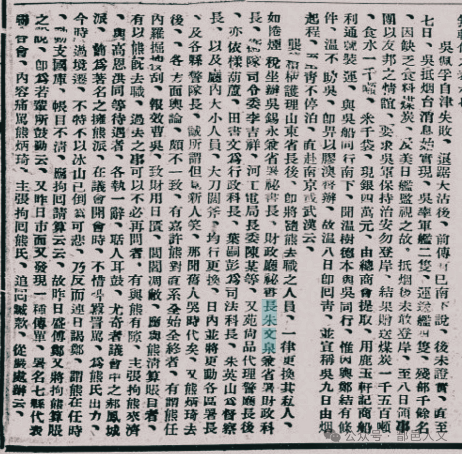 另据民国十九年(1930年)九月二十日《南京晚报》所载《鲁旧省委离济南下》表述:“山东省府各委员会自奉到改组命令后,各厅即积极赶办交代,一面催促新任鲁主席韩复榘早日就职,韩以国府正式命令尚末颁到,故就职日期未能确定。”此时,新任省府主席不能及时到位,而前任陈调元又急于到安徽任职,故提前召开省府例会,“至各厅交代,均派有负责,民政厅由秘书长甯坤代行,财政厅委第二科科长朱文泉代行……”。此消息表明,在陈调元卸任山东省政府主席前的最后一次例会,安排朱文泉主持财政厅工作,代行厅长职责。这是我们可查到的关于朱文泉的最后一份资料。